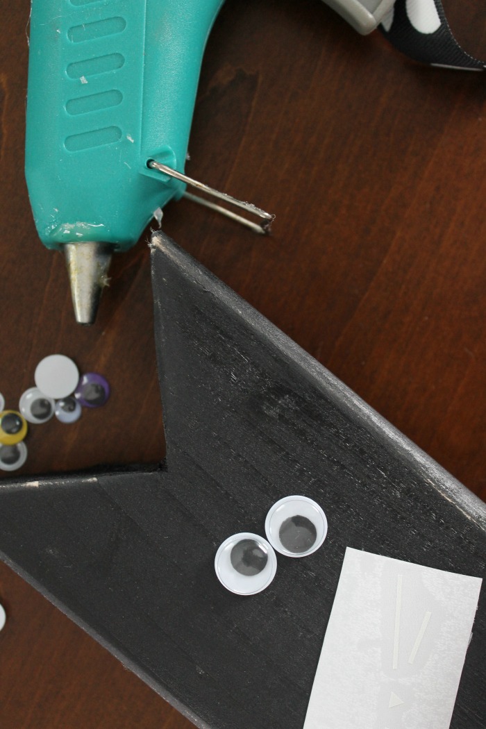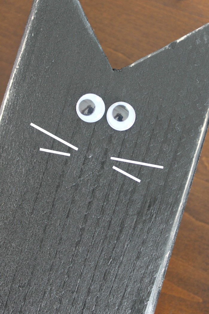 I hot glued on the eyes and then I applied vinyl whiskers. You could also draw those on with a paint pen, if you’d like!