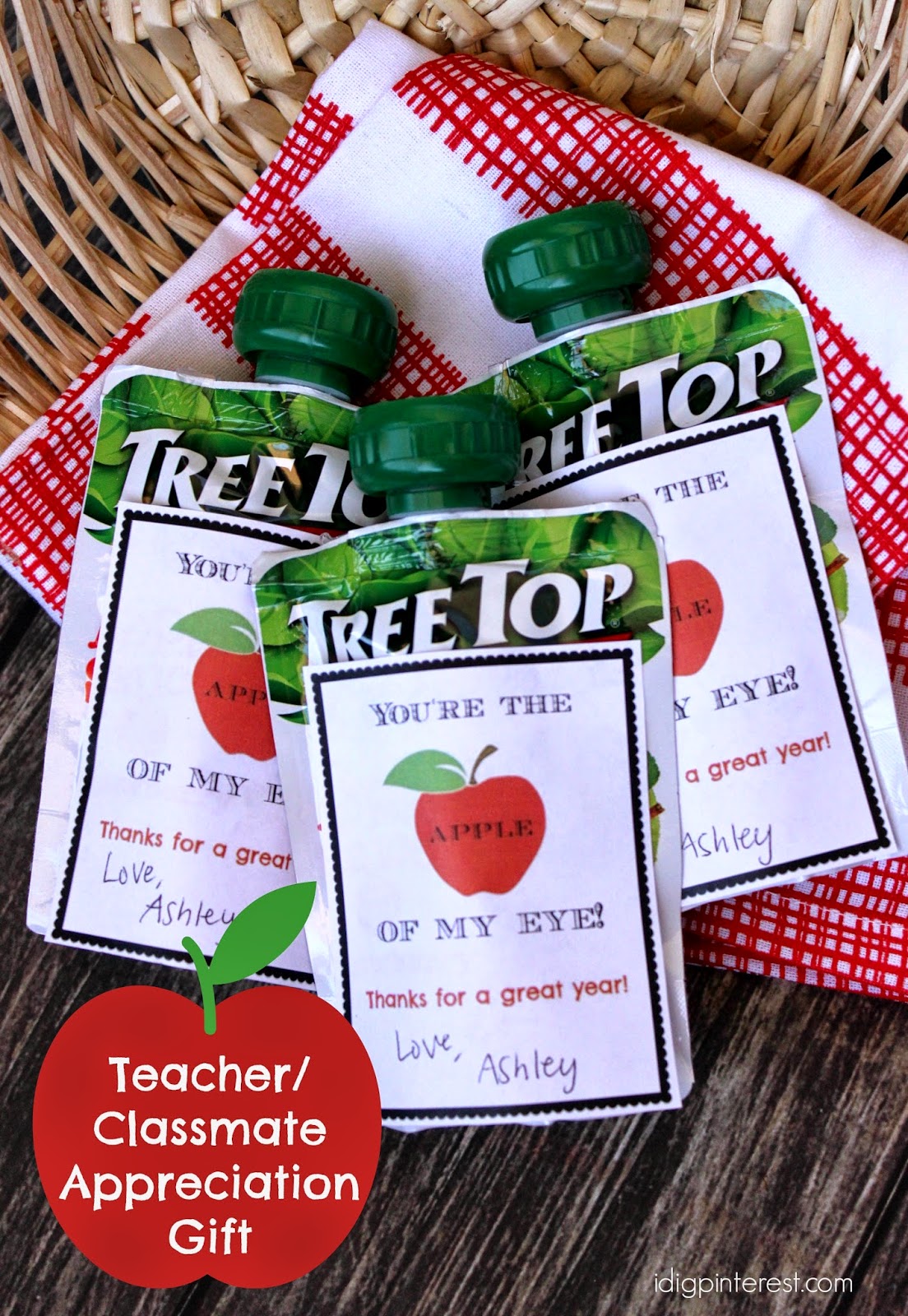 The end of the school year is nearing, which means it’s time to think about creative, thoughtful teacher and classmate appreciation gift ideas! This “You’re the apple of my eye” free printable attached to a Tree Top Apple Sauce Pouch is simple and heartfelt.