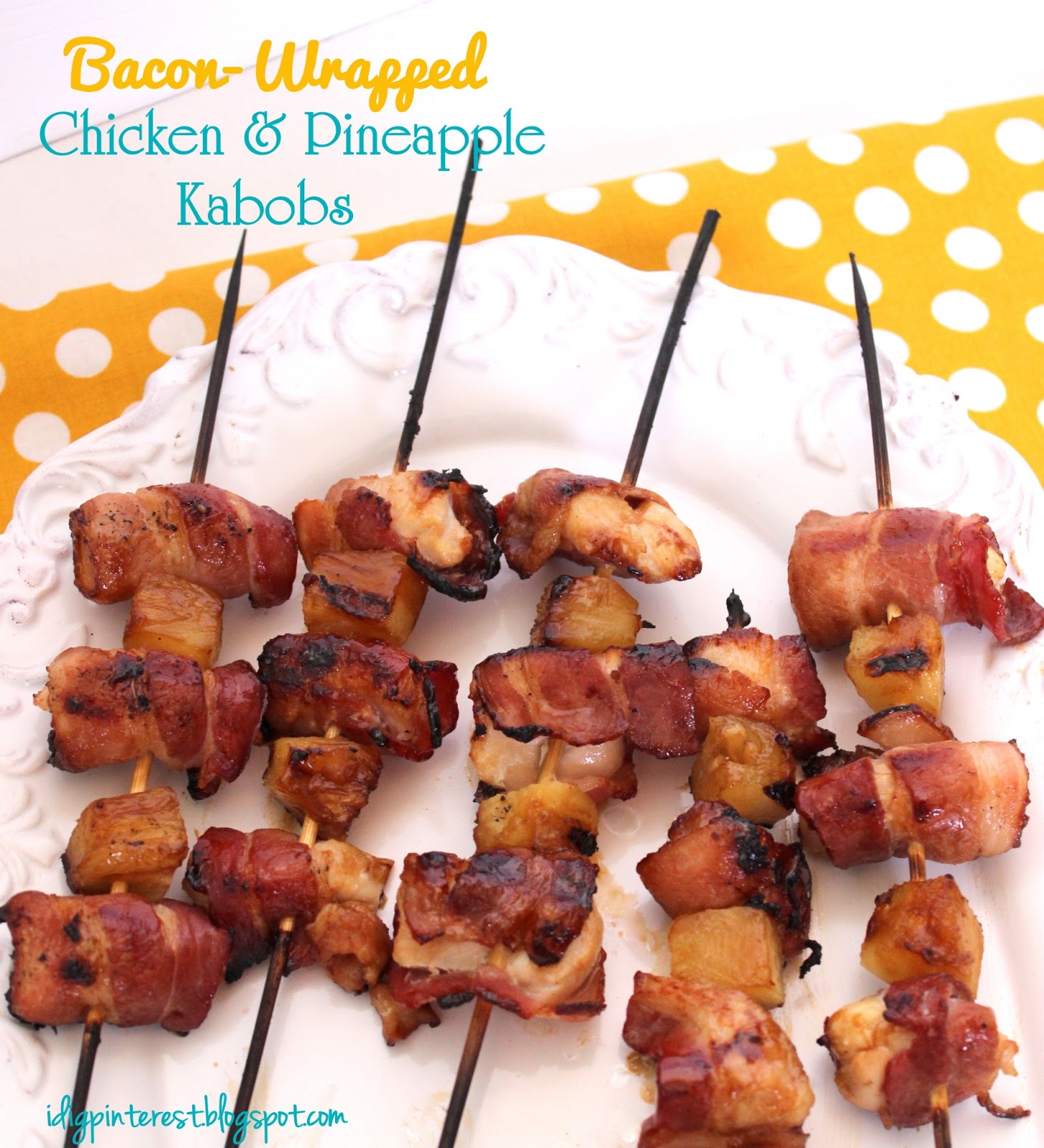 - Wrap a piece of bacon around a piece of chicken and poke the skewer through it. Push the meat all the way to the bottom. Top with a pineapple chunk. Repeat the process so there are three pieces of bacon-wrapped chicken on the skewer and two pineapple chunks. Do the same for your remaining skewers. I ran out of bacon, but still just skewered the chicken and pineapple at the end.