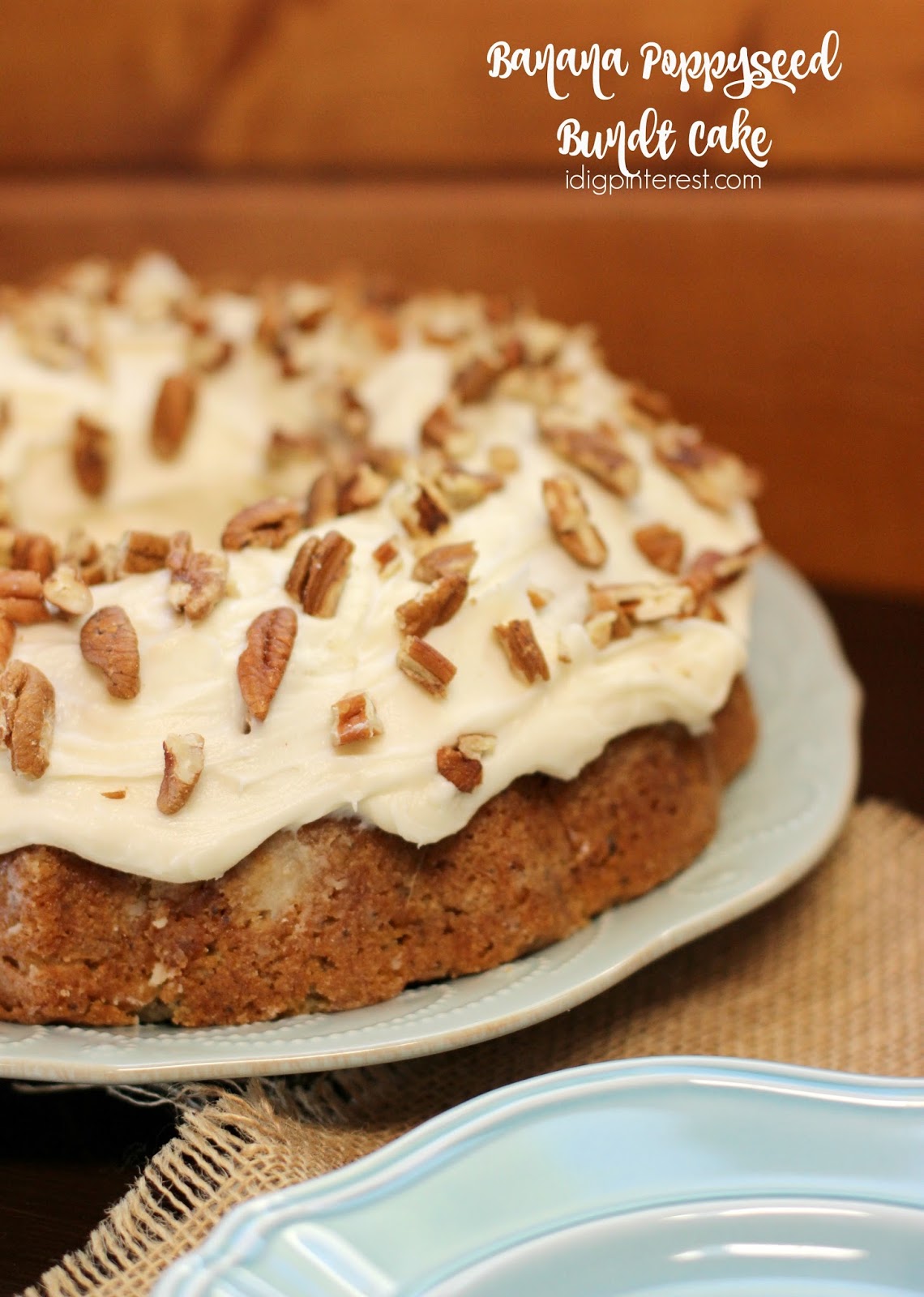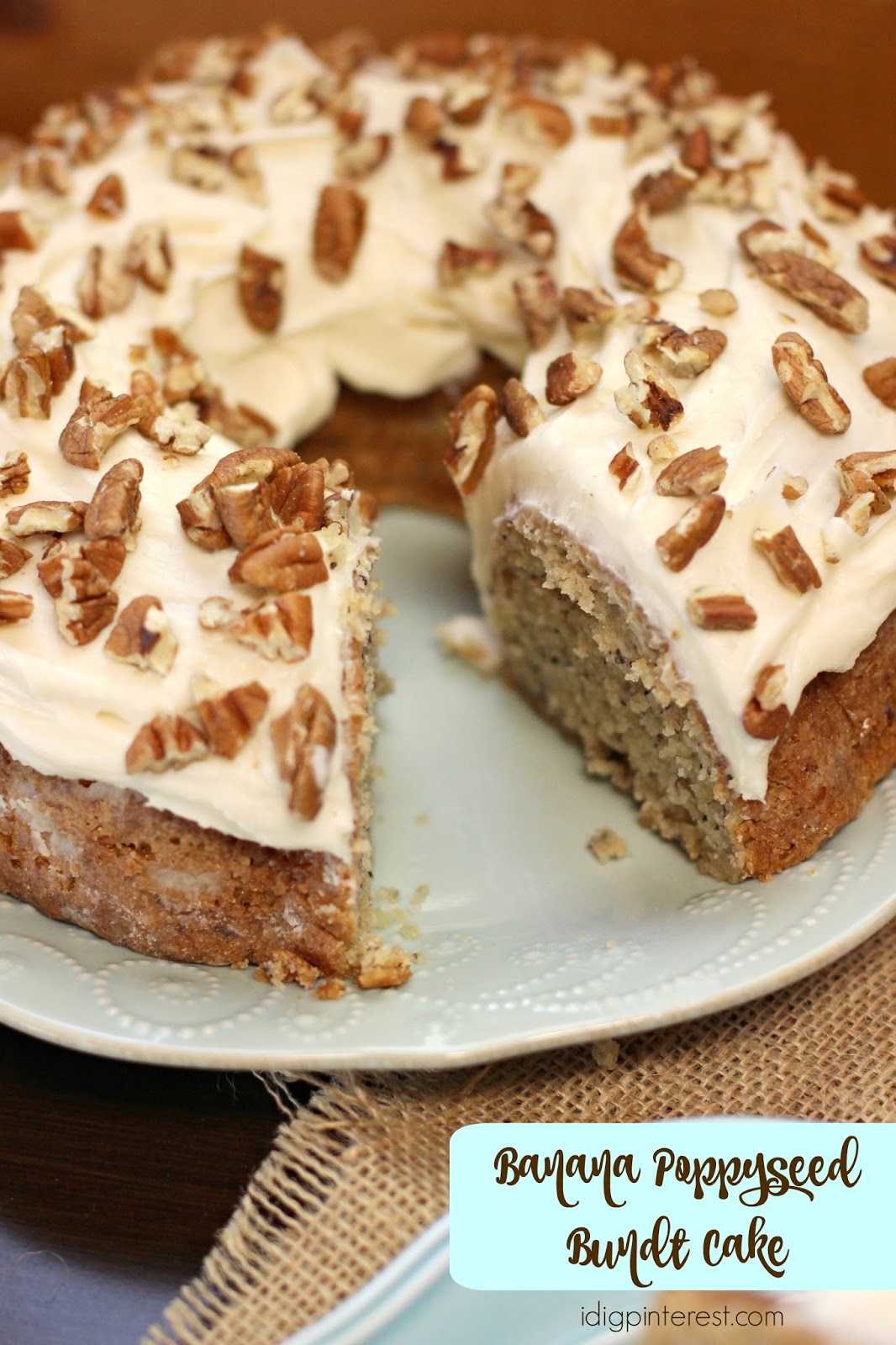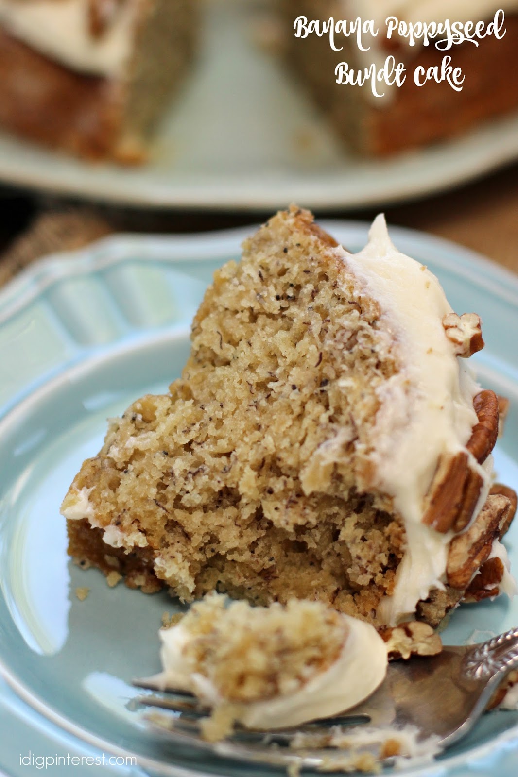 Preheat oven to 300 degrees Fahrenheit (the low temperature helps keep the cake from getting dry). Grease and flour a 10″ bundt cake pan. Mash bananas and stir in lemon juice and poppy seeds. In the bowl of an electric mixer, cream together butter, canola oil and sugar. Add eggs, mix, then add vanilla. Mix just until combined. In a separate bowl, stir together flour, baking soda and salt. Add flour mixture and buttermilk mixture alternately while mixing. Scrape sides to make sure everything is well incorporated. Stir in banana mixture by hand just until incorporated.