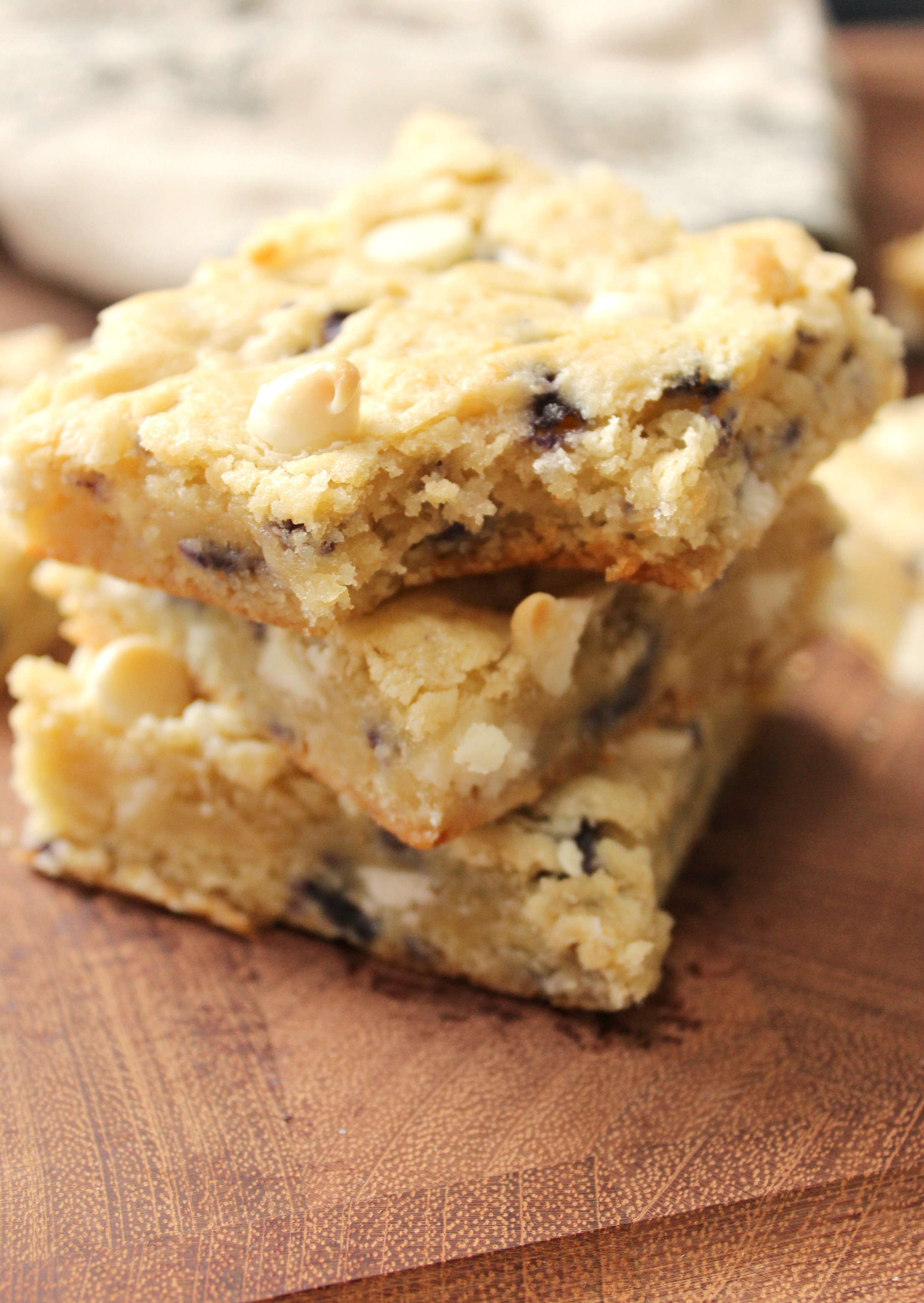 These Blueberry Cheesecake Cookie Bars taste like a delicious blueberry muffin in cookie form! The cream cheese makes them super soft and the white chocolate chips add the perfect finishing touch!