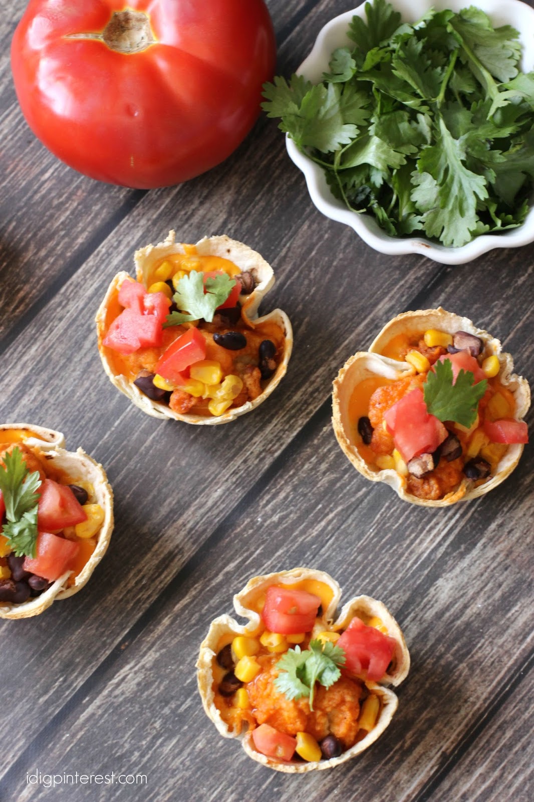 Push each tortilla circle into the muffin mold and place a spoonful of nacho cheese/queso sauce in the bottom.  Pull your chicken bites out and toss them with the thawed buffalo sauce packet.  Place one chicken bite in the center of each tortilla boat, then top with black beans and corn.  Bake for an additional 10 minutes.  Remove from oven and sprinkle with diced tomatoes and a few sprigs of cilantro.