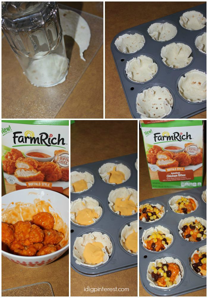 To throw these puppies together, preheat your oven to 425 degrees Fahrenheit and bake your Farm Rich Buffalo Style Chicken Bites on a cookie sheet for 6 minutes.  In the meantime, grab a large-mouthed mug or large circle cookie cutter (mine was about 4″ in diameter) and use it to cut or as a guide to tear tortilla circles that will fit nicely into a regular muffin tin.  Be sure to coat your muffin tin with non-stick cooking spray first.