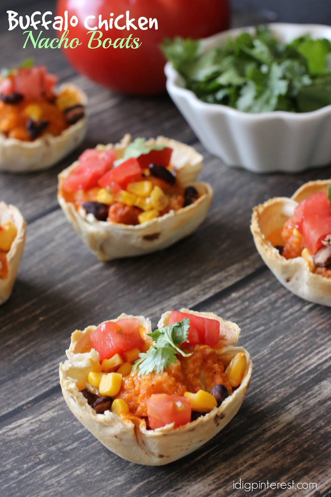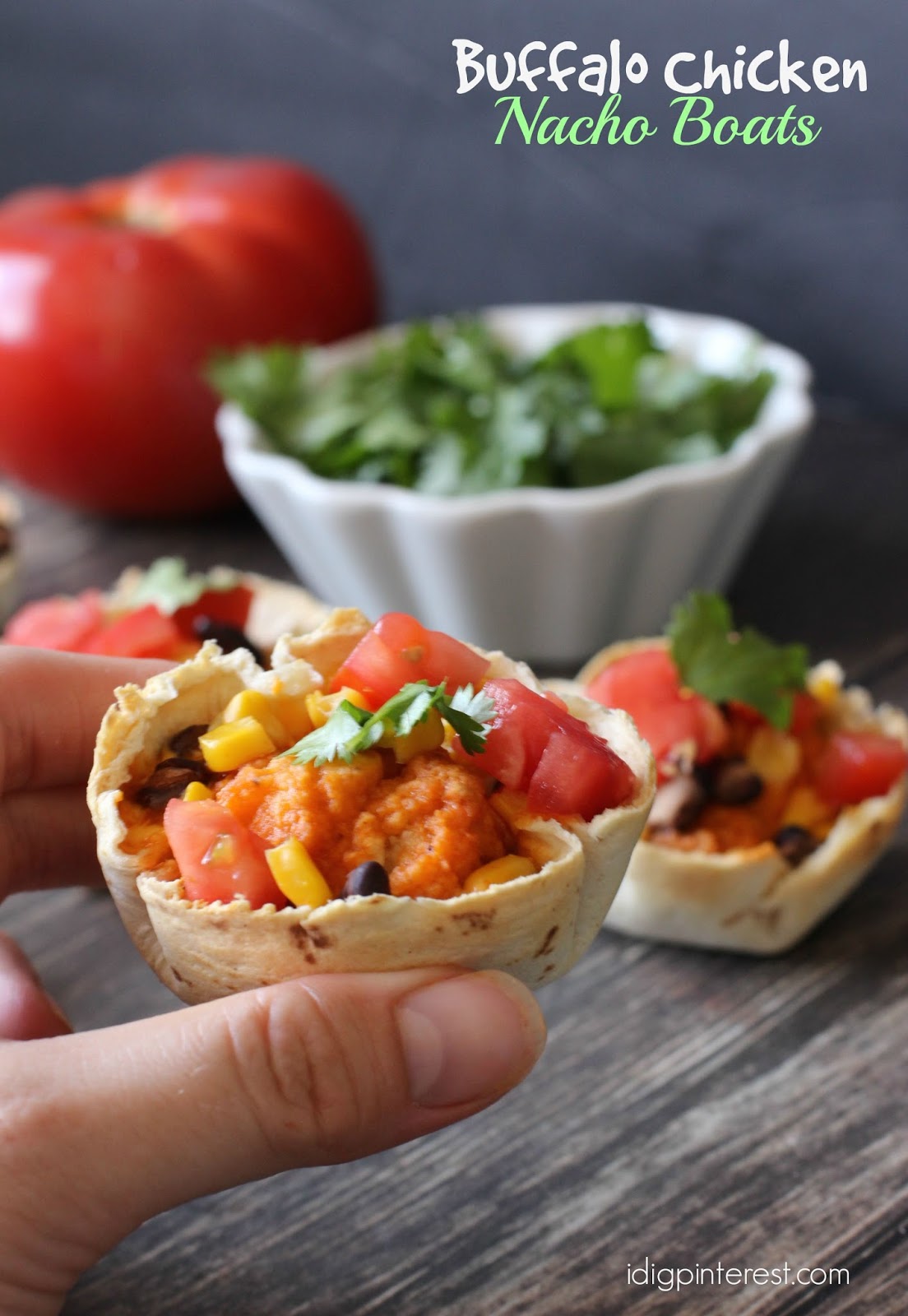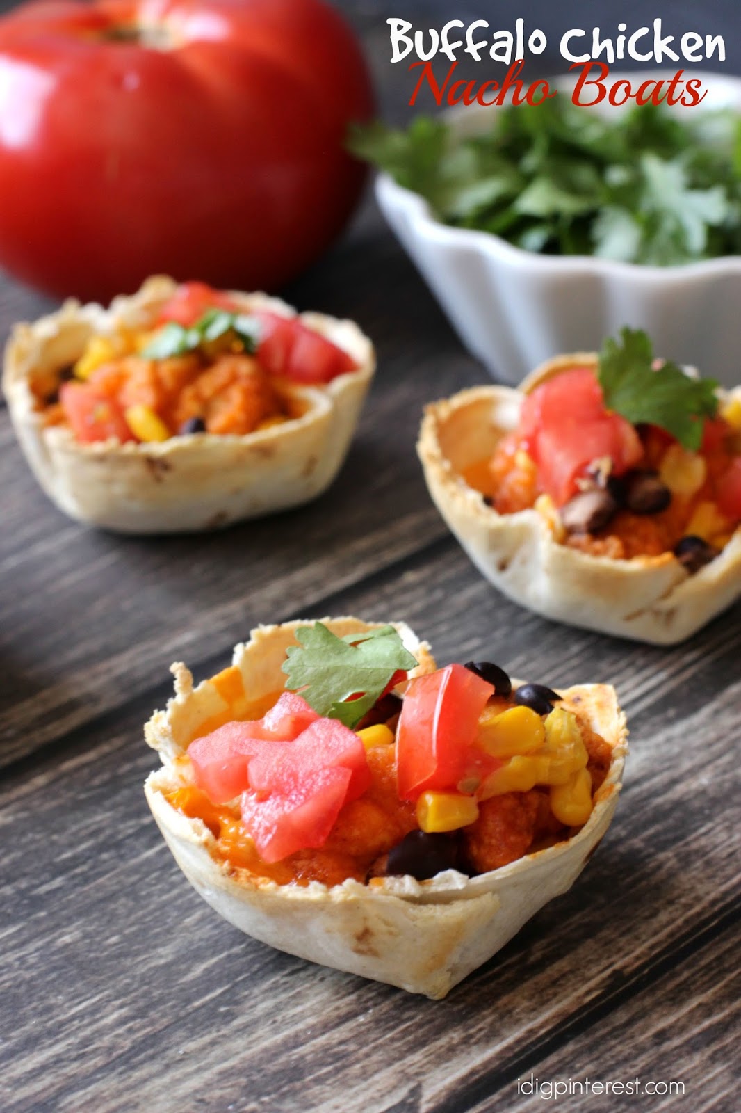 When those afternoon munchies hit, these Buffalo Chicken Nacho Boats are a delicious way to satisfy that growling stomach and tide you over until dinner!  A crispy tortilla shell encasing the mother load of yumminess inside…nacho cheese sauce, Farm Rich Chicken Buffalo Bites, bits of corn and black beans with a touch of cilantro.  Oh, yes!