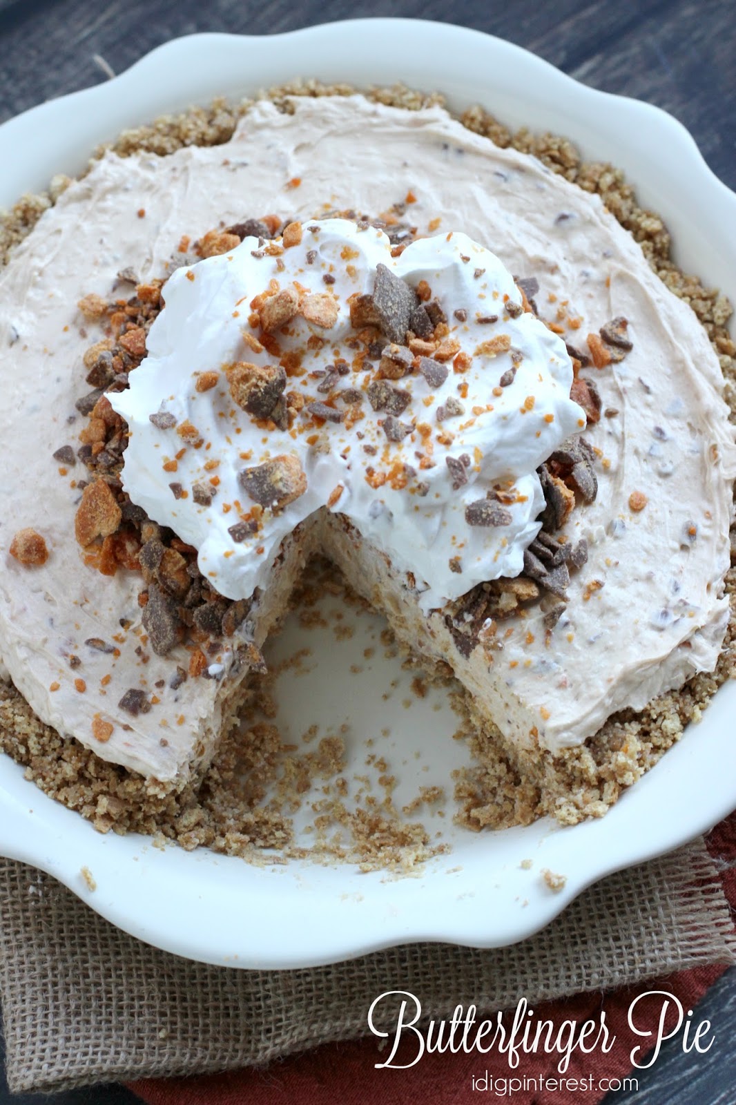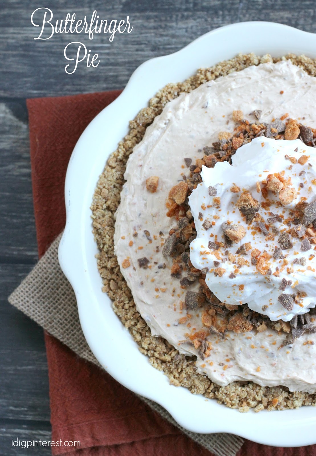 We always race to see who can finish the main course quickest and be first to dig into the pie.  I always save my appetite for dessert.  I don’t mind just a small helping of meat with an average portion of potatoes, because I want my tummy to have plenty of space left for decadent pie.  I’ll save extra space if today’s Butterfinger Pie is on the menu!