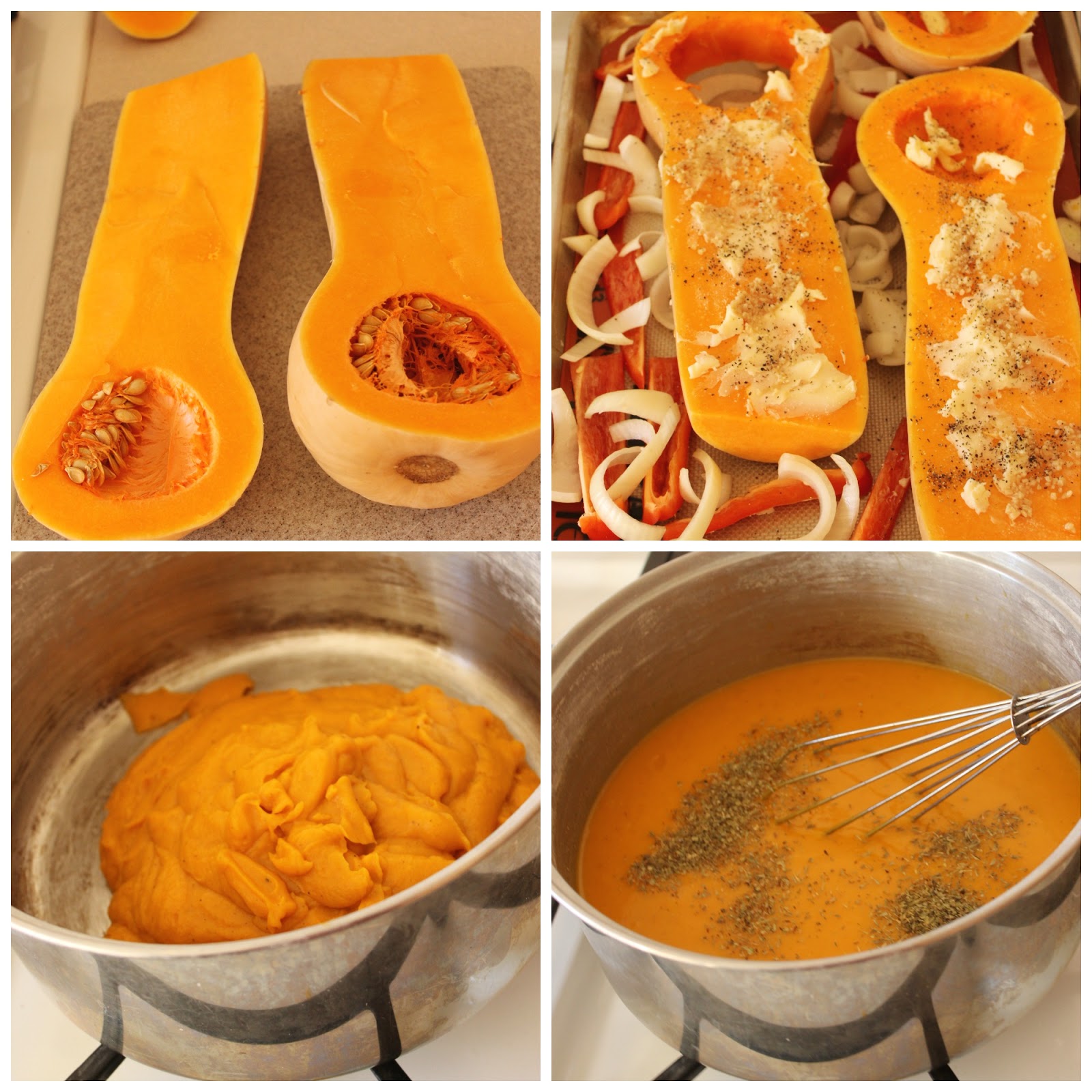 When the squash is fully roasted, remove it from the oven and scrape it from its skins. Place the squash, roasted red pepper slices and onion slices in an immersion blender and puree until nice and smooth. Make sure you include the melted butter that will pool in the bottom of the squash.