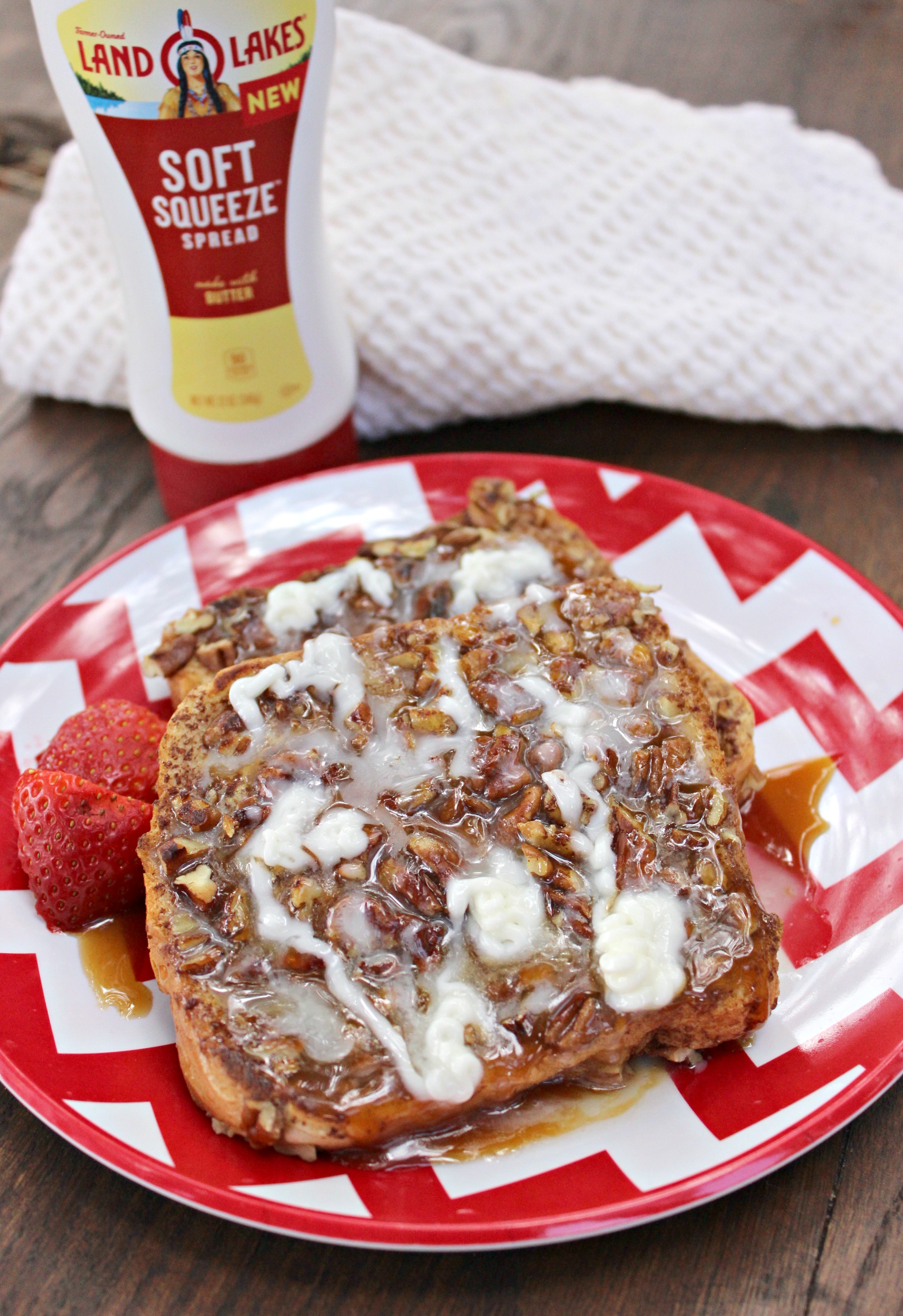 Now finish them off with some caramel syrup, fresh strawberries and some New Land O Lakes® Soft Squeeze™ Spread! We’re going to be making this French toast often! The crunchy pecans with the caramel syrup and soft squeeze spread is absolutely heavenly!