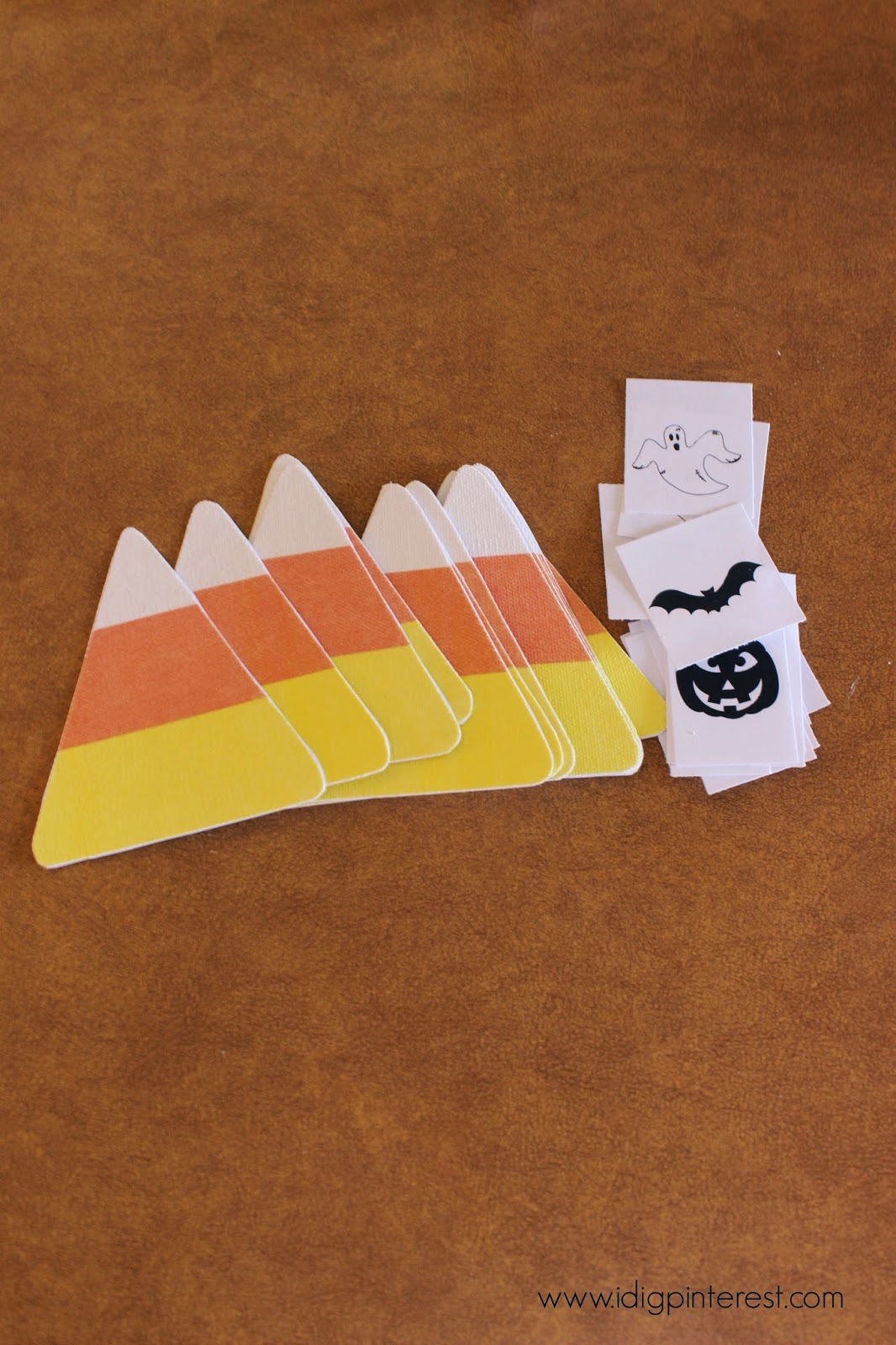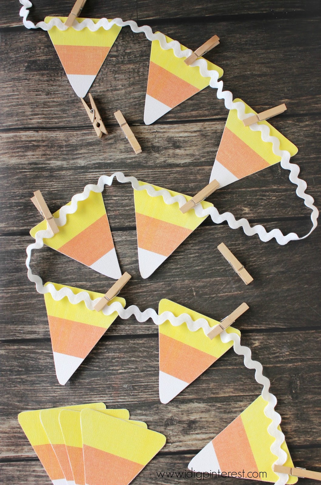 I made it with my Silhouette craft cutting machine, but if you don’t have access to one, simply find some candy corn images online, print, cut and string! Then glue the Halloween images on back.