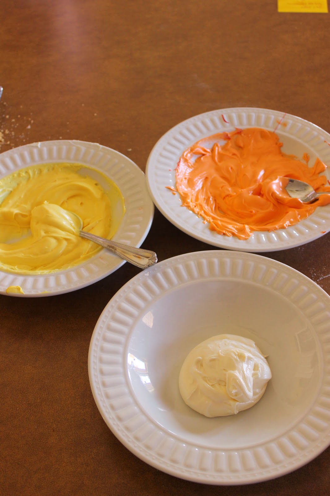 Now split your frosting into three bowls. You’ll need the most of yellow and the second most of orange, followed by the least of white. Use food coloring or gel to achieve the desired yellow and orange colors. I prefer gel because it has a more concentrated color.