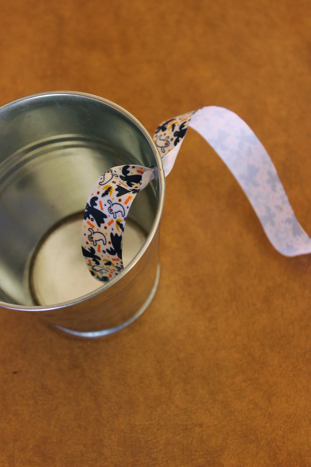 Now do the same for the other side, and you’ve got a cute ribbon handle! I ended up swapping the Halloween ribbon out for some white rick rack because I liked the look of it better against the candy corns.