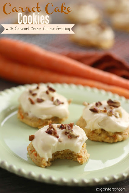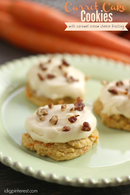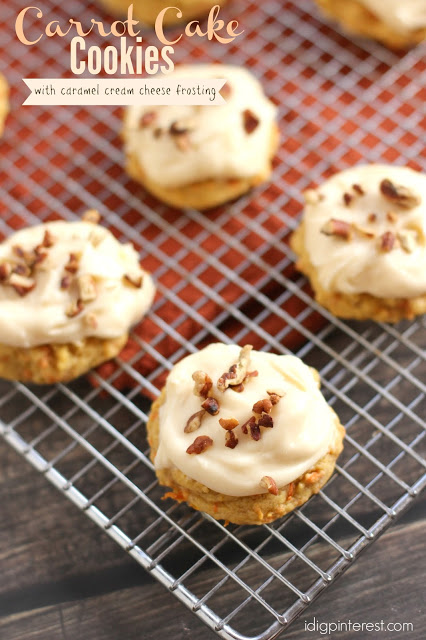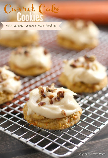 These are perfect in every way! I have never had a carrot cake cookie, but carrot cake (w/cream cheese frosting) is one of my favorite desserts...then you added caramel and pecans to this already heavenly creation. Hot diggety dog! Pinned it. Thank you! #ThursdayFavoriteThings