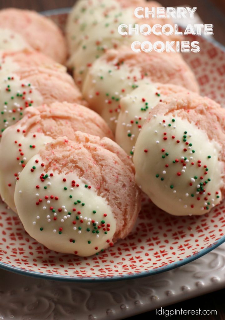 Christmas goodie plates won’t be complete without these soft cake mix cherry cookies dipped in white chocolate! Give them a festive holiday touch with some green, red and white sprinkles!