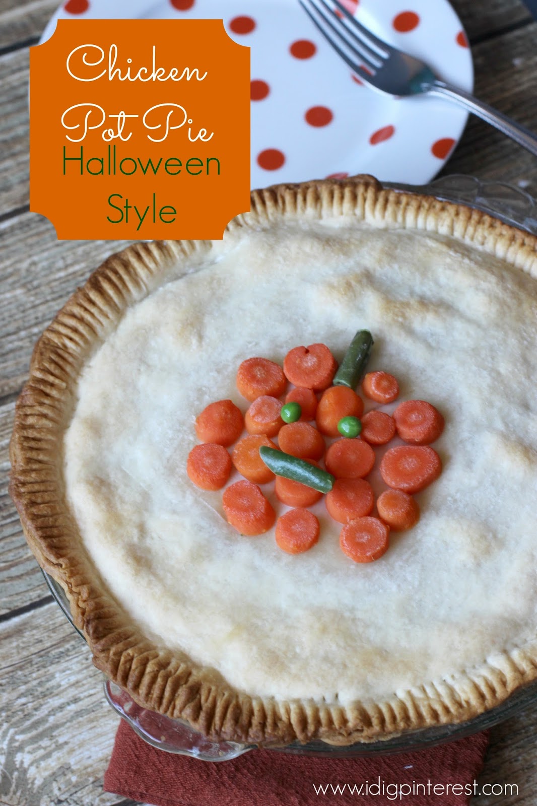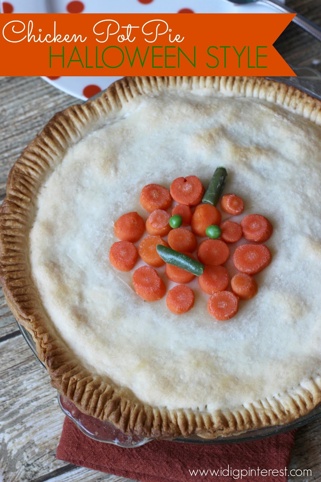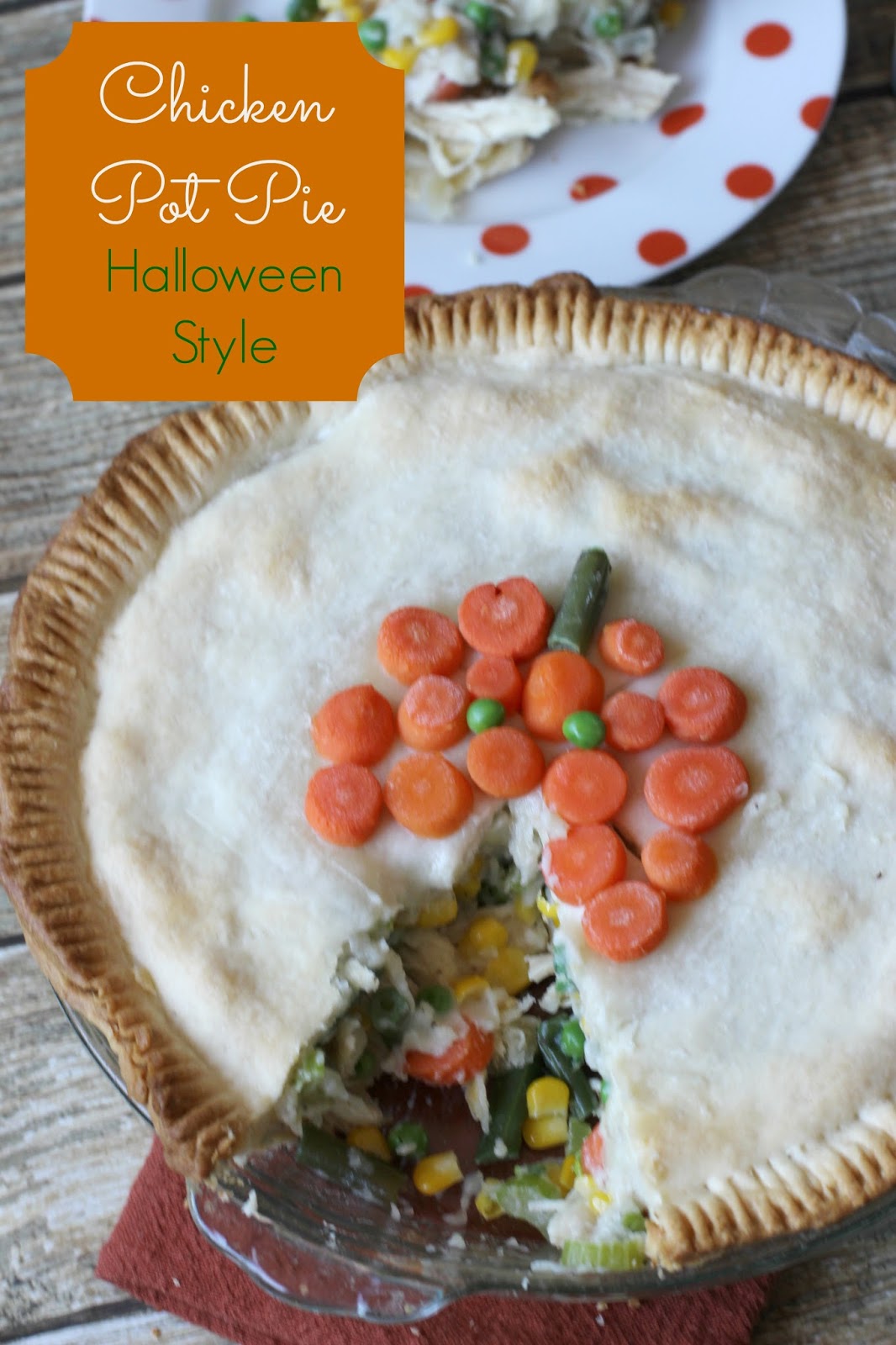 When Halloween time comes around, I love trying to find ways to make our normal meals a little more festive…like with this Chicken Pot Pie with a cute edible veggie pumpkin decoration on top!