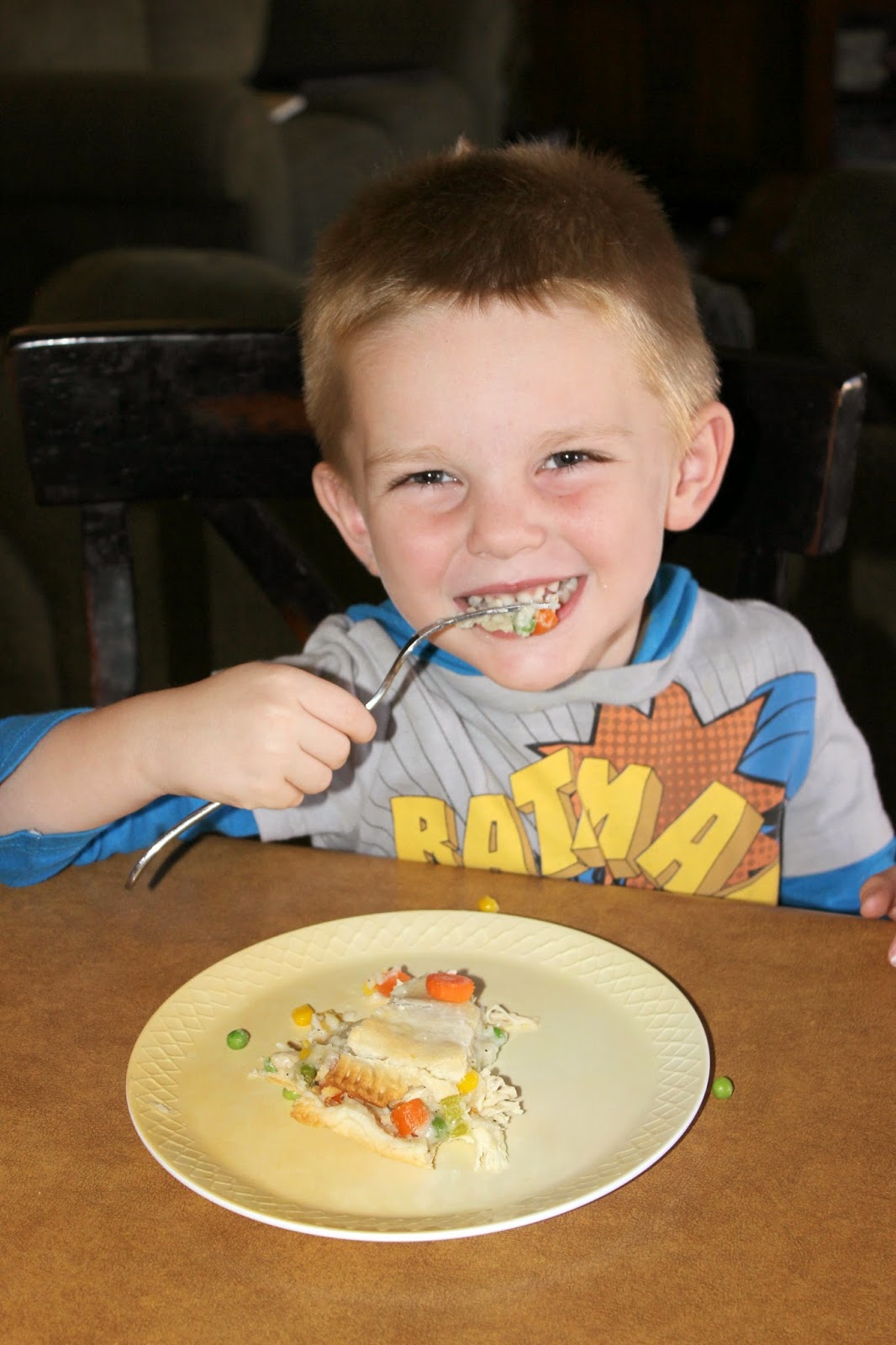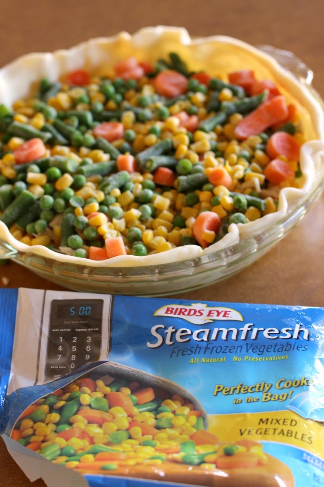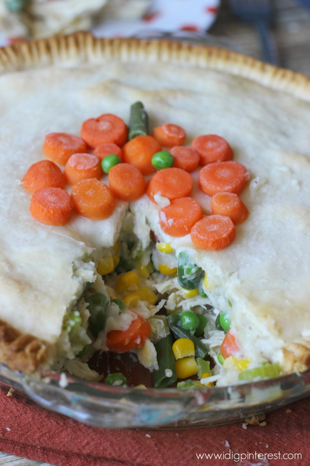 When Halloween time comes around, I love trying to find ways to make our normal meals a little more festive…like with this Chicken Pot Pie with a cute edible veggie pumpkin decoration on top!