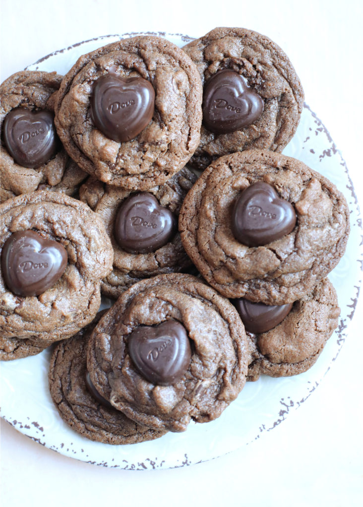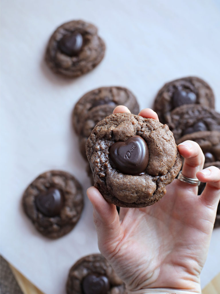 With Valentine’s Day approaching, I frequent the seasonal candy aisle every time I grocery shop. When I saw these delightful dark chocolate hearts, I grabbed a bag. I knew they’d be perfect on top of cookies! But, if it’s not Valentine’s season, you can also sub in any other kind of chocolate candy-Hershey’s Kisses or other Dove pieces. I’m all about the dark chocolate, so I stirred in some dark chocolate chips and then used dark chocolate hearts. But if you’re not a dark chocolate fan, you can of course use milk chocolate.