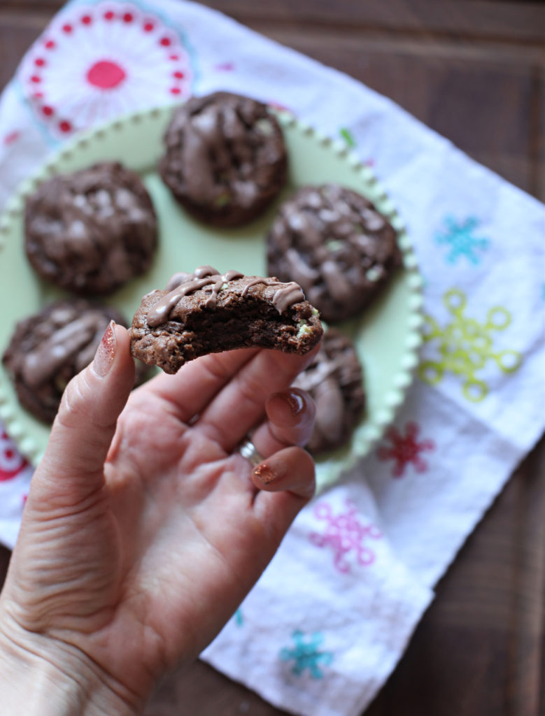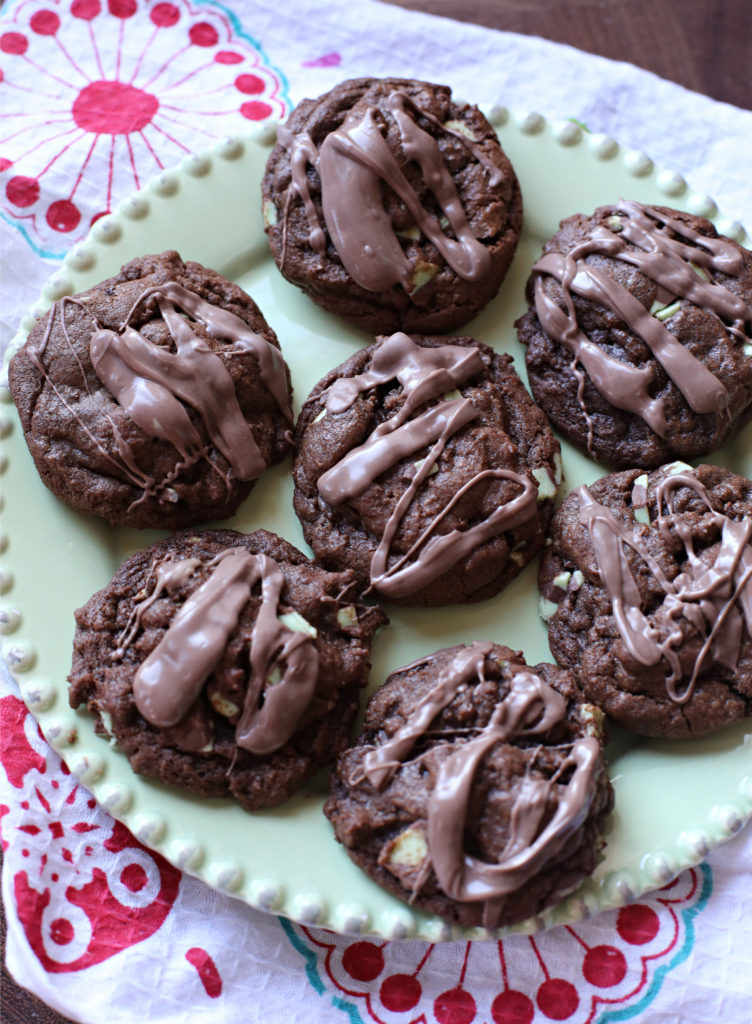 - After they're cool, melt about 3/4 c. chocolate mint baking pieces in the microwave and stir until smooth, then drizzle over the cookies and let set and cool completely. Store in an airtight container.