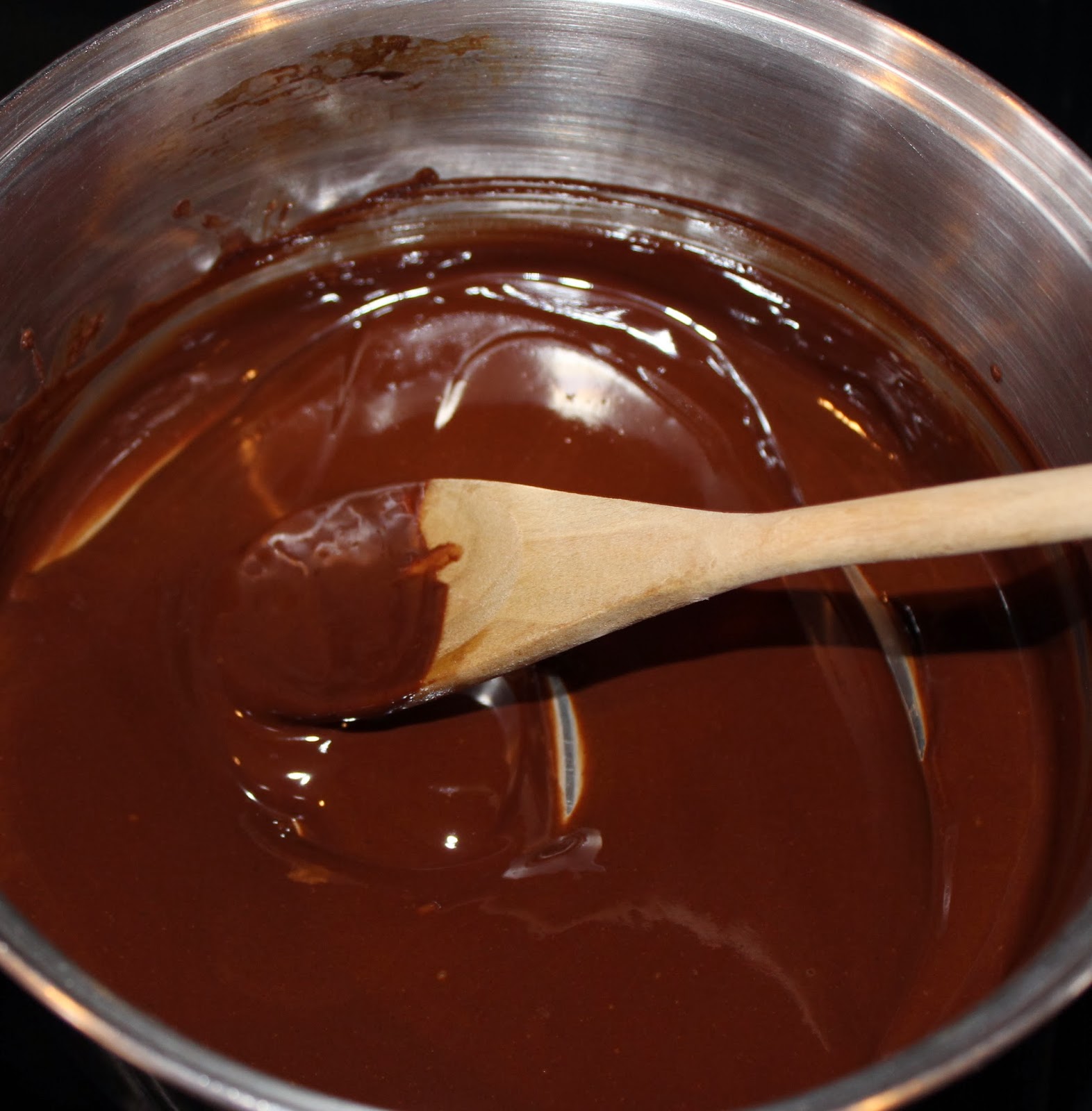 Melt chocolate and butter, stirring constantly to prevent burning.