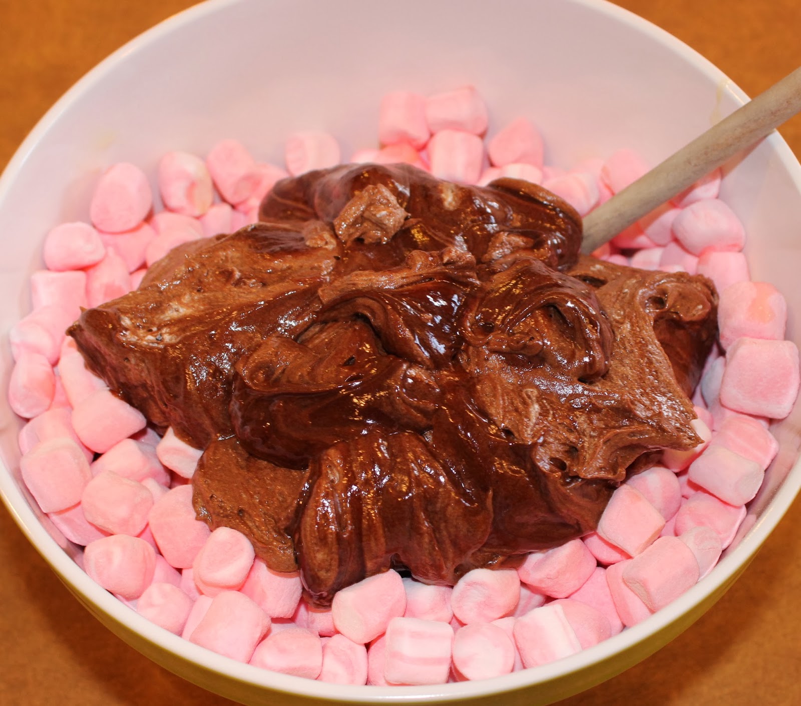 Add some Kraft® Jet-Puffed Peppermint Mallows on top of your egg/powdered sugar mixture.  Feel free to swap in any Kraft® Jet-Puffed Marshmallows of your choice.  Add walnuts and the Cool Whip/Chocolate mixture.  Fold all together until completely combined.To enhance the peppermint flavor, throw in some crushed candy canes at this point!  It’s totally optional, but could make this dessert even more fabulous.