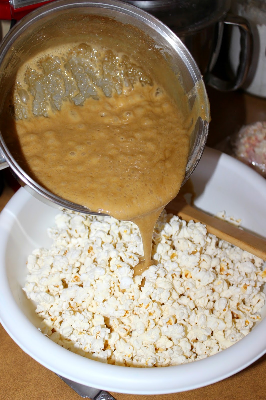 Melt Baker’s chocolate and pour over the 3 c. of caramel popcorn.