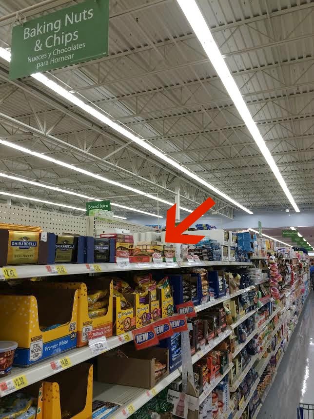 The Baker’s chocolate is on the baking aisle at Walmart with all the chocolate chips.