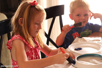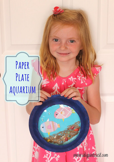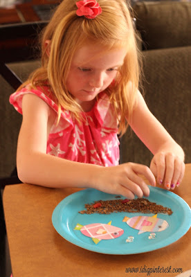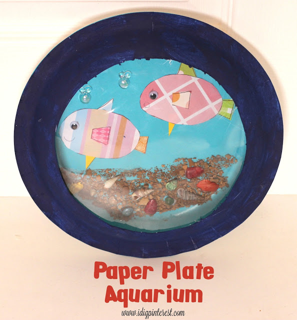 Now, using Elmer’s Glue, glue the fish pieces together. Glue on the googly eyes, and glue the fish to your other blue plate. This will be the back portion of your aquarium. Glue on your bubbles (I used Hot Glue).Spread a thin coating of Elmer’s glue on the bottom portion of your plate. Sprinkle on the dirt or sand to cover the glue, then glue on your seashells. We found that Hot Glue was needed for this part, but maybe we just weren’t patient enough in allowing the Elmer’s Glue to dry. 🙂