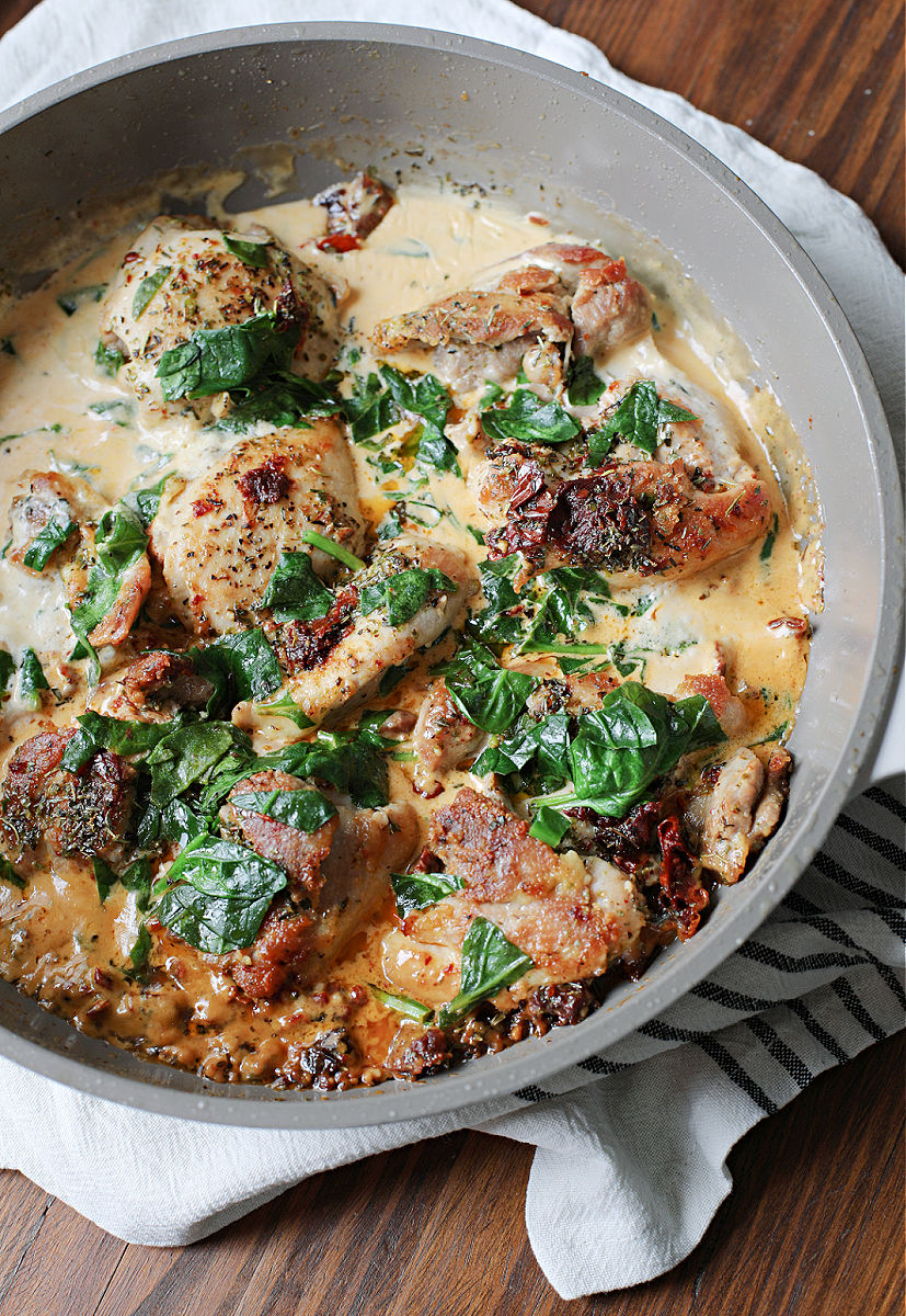To prepare this recipe, you’ll first cook the chicken completely through in the skillet (flipping in between) with a little olive oil and seasonings. Then, you’ll add minced garlic, sun-dried tomatoes, and Italian seasoning and allow that to cook for a short period. Next, stir in the heavy cream, parmesan, and chopped, fresh spinach and allow the sauce to lightly boil and thicken. Then enjoy by itself or over pasta!
