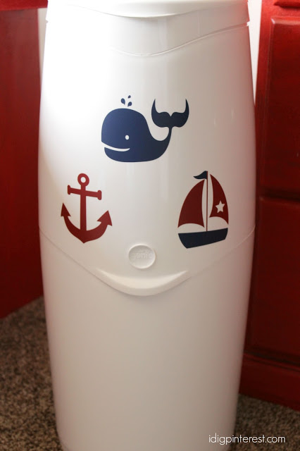 You will be amazed at how simple it was to create this adorable look! I pulled up Silhouette Studio and sized these cute spouting whale, anchor and sailboat designs that I purchased from the Silhouette shop. Then I used my Cameo to cut the designs using blue and red vinyl. Lastly, I transferred them to the front of the Diaper Genie. I cannot get over how cute it is!