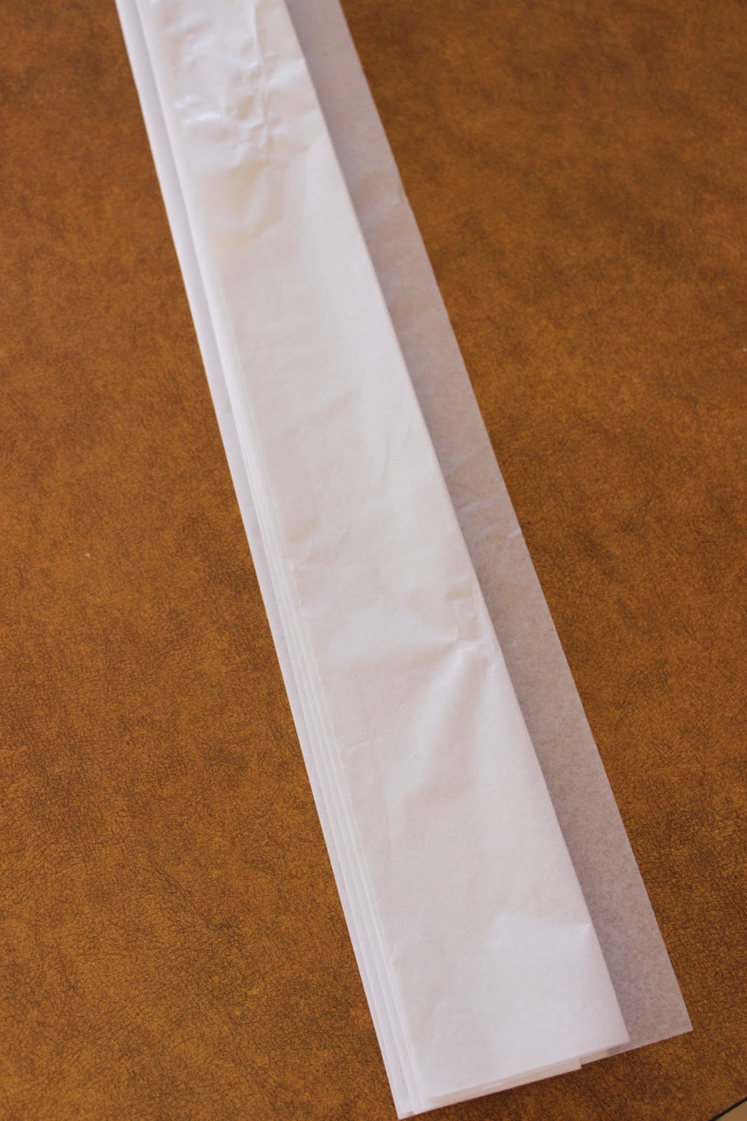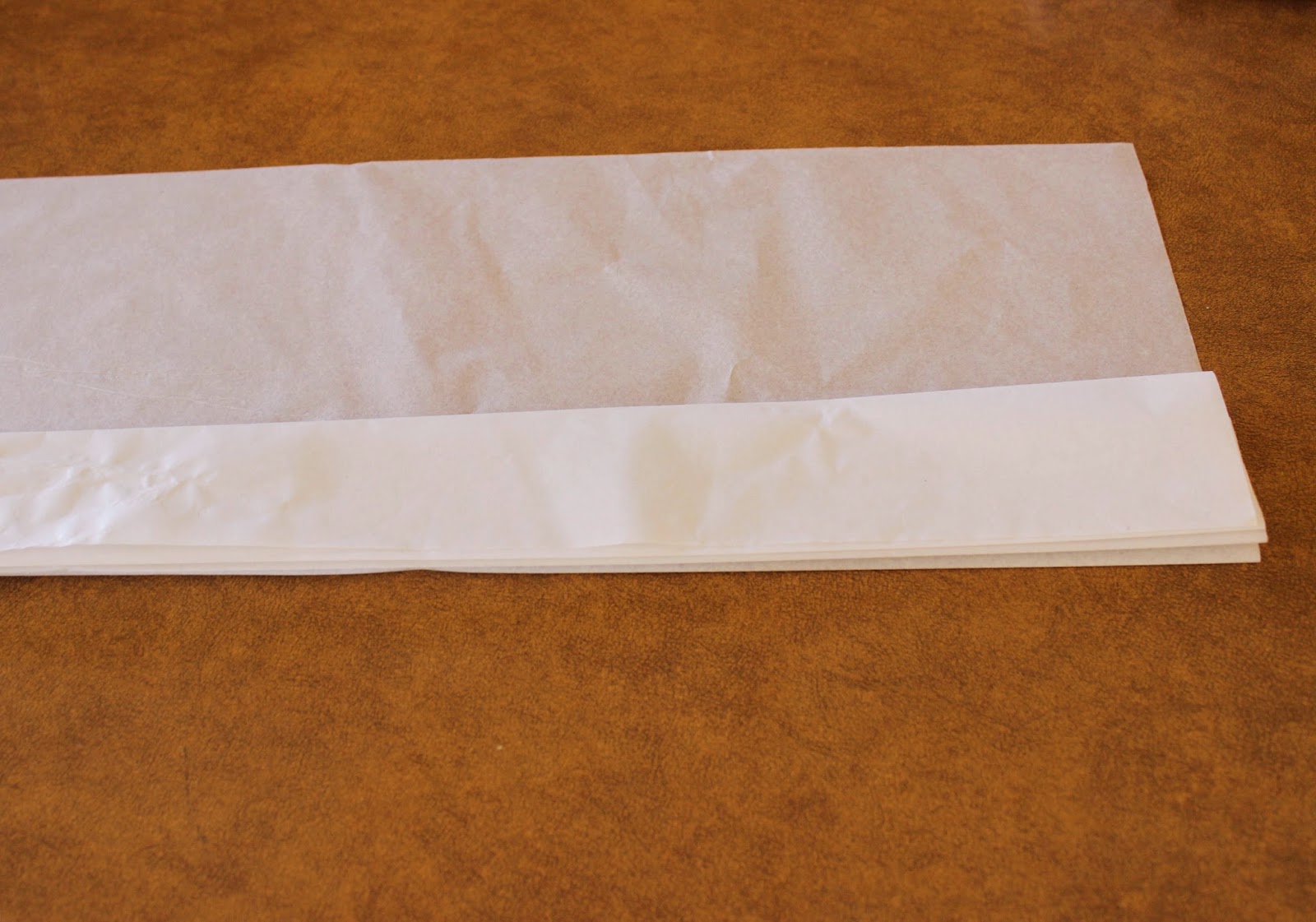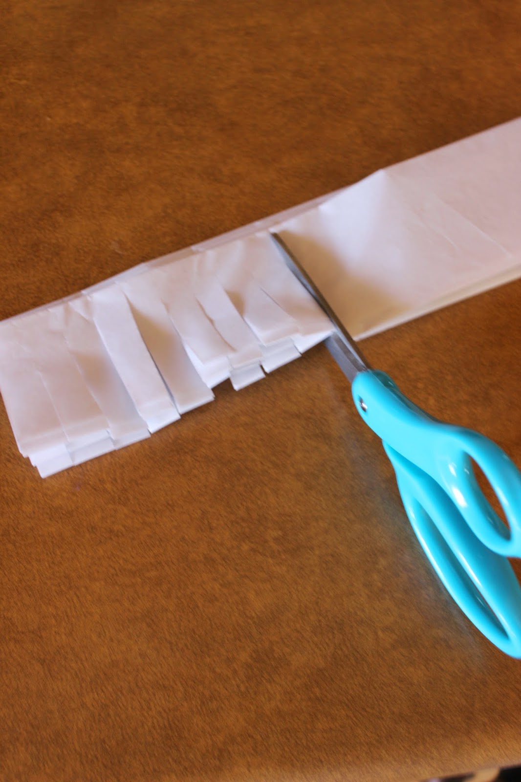 Begin by putting four pieces of tissue paper together and folding them accordion style, with folds about 2 1/2″ wide. Be sure to get the folds as even as possible.