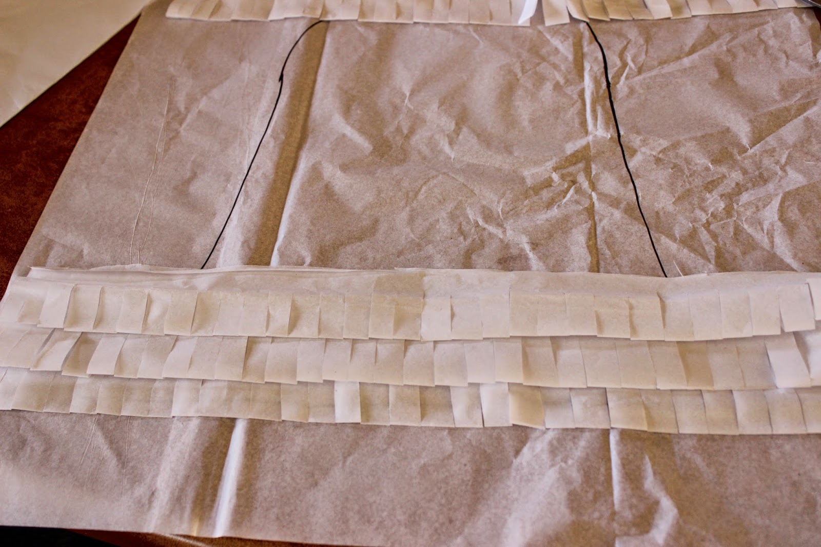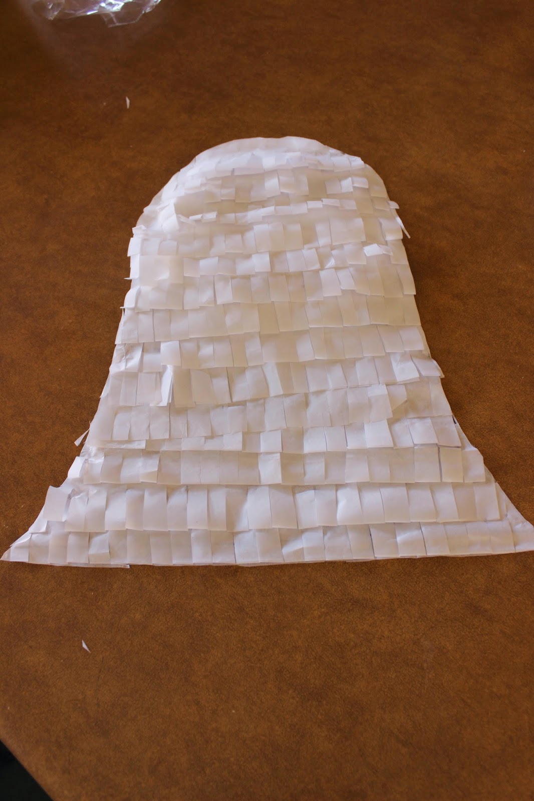 Separate your fringe pieces (most pieces will be double layered, but that’s good). Starting at the bottom of your ghost, lay them out how you like them, going all the way up.