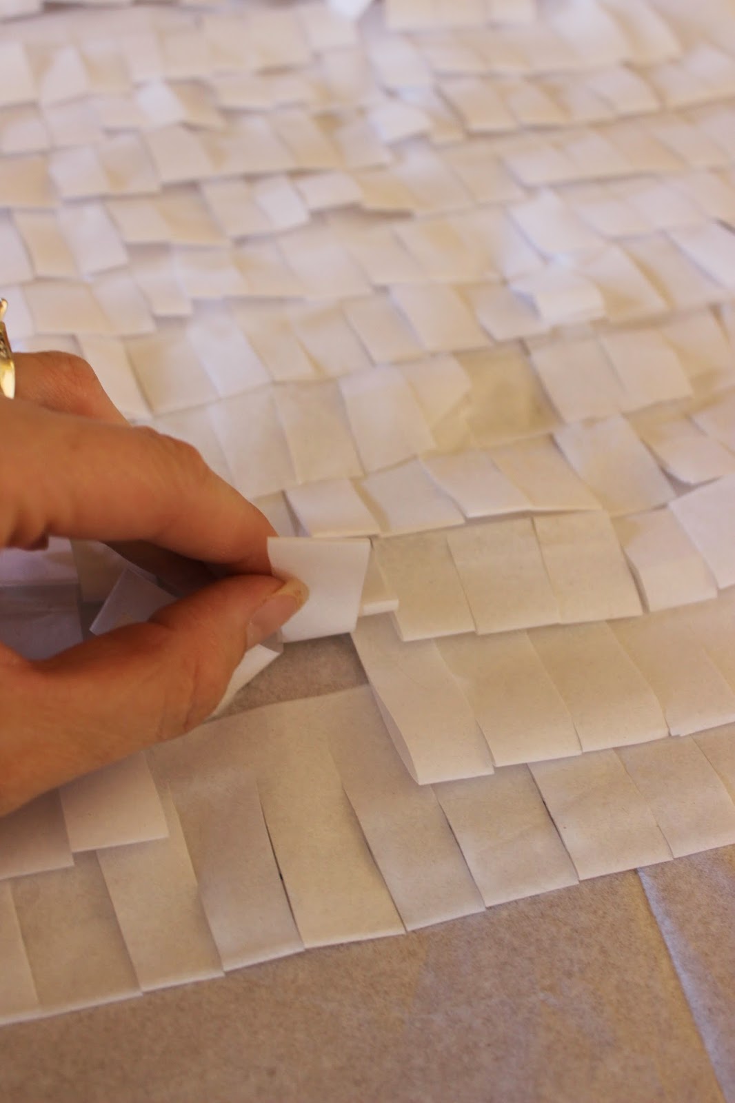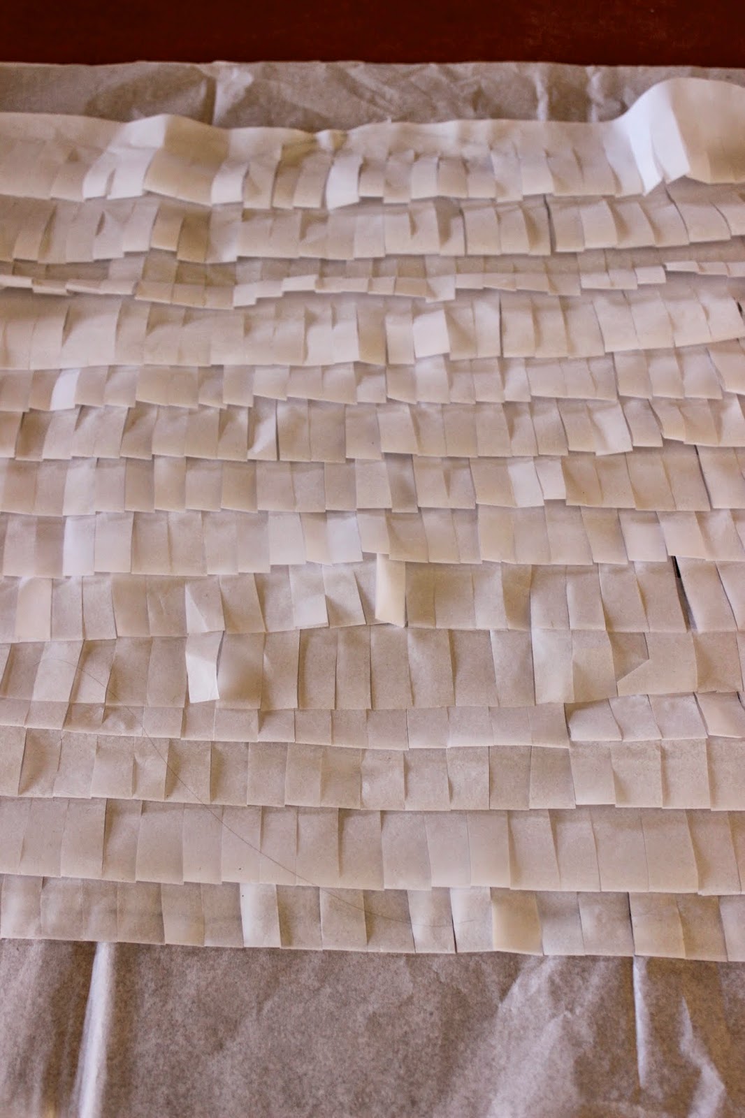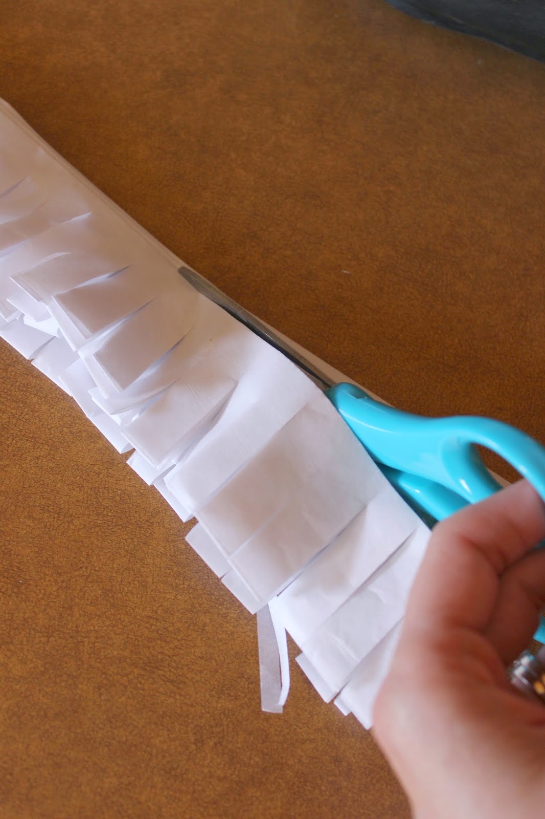 Now we’re going to separate the pieces by cutting across the top. Be sure not to cut too far down because you’ll need space for gluing, and we wouldn’t want to mess up that pretty fringe.