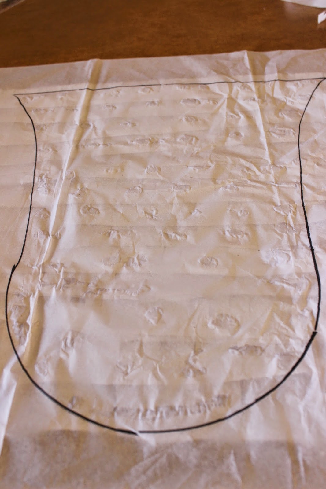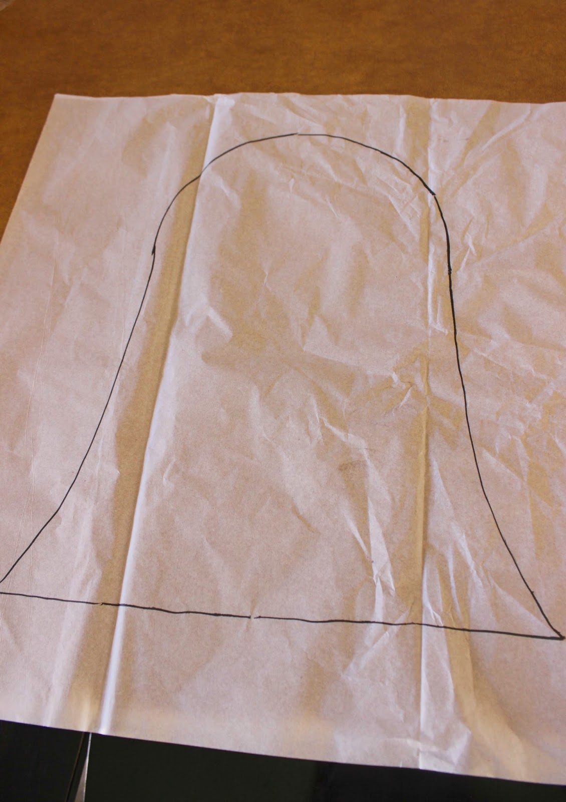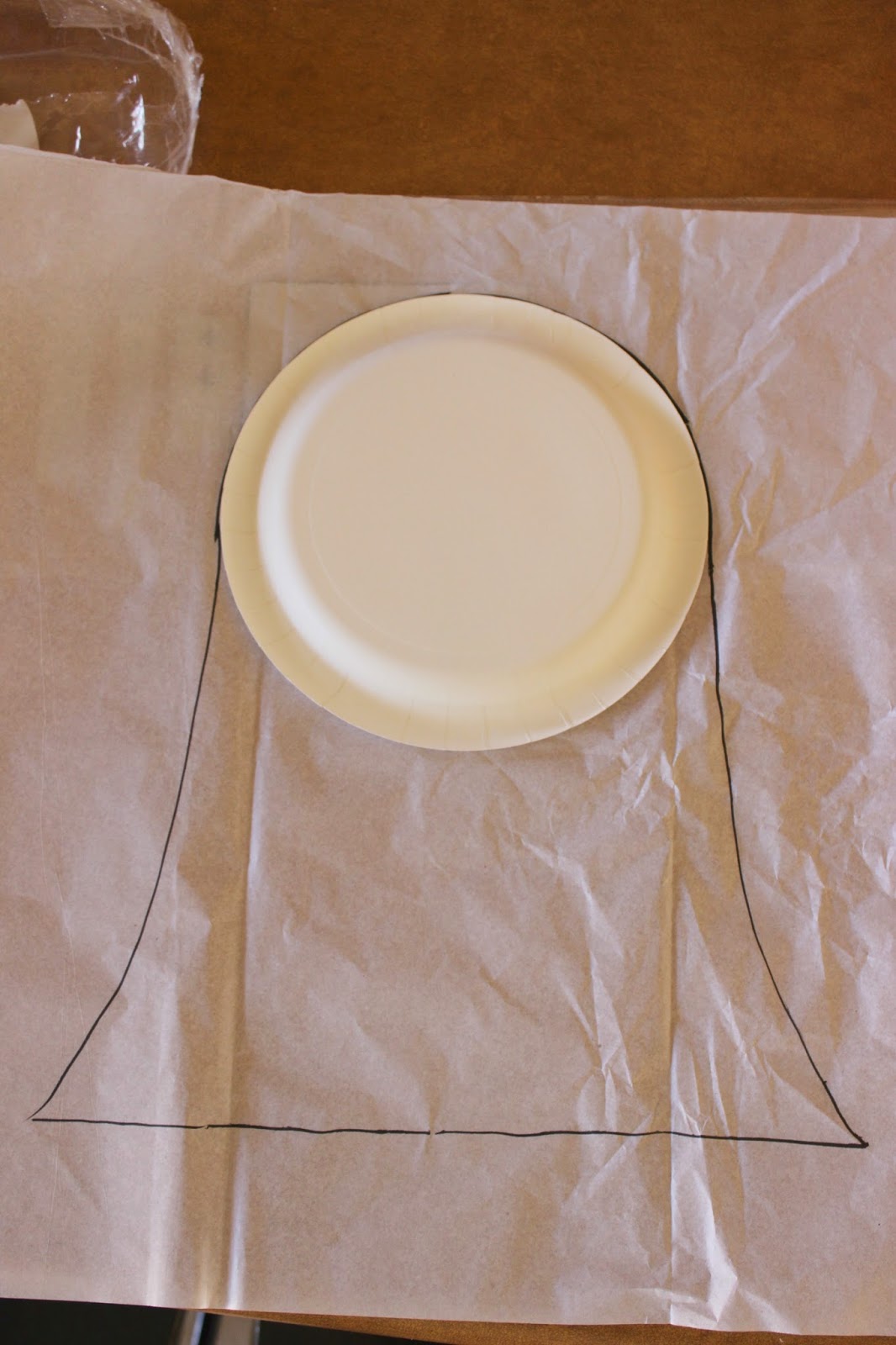 Begin by laying your paper plate out on a piece of white tissue paper, or, for better durability, a piece of white posterboard. I didn’t think it all the way through at first, so I used tissue paper and then backed it with something more sturdy afterwards. Draw a ghost shape, using the rounded edge of the paper plate on top for the head portion. Mine turned out to be basically a bell shape.