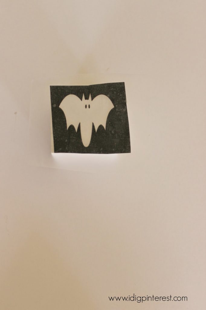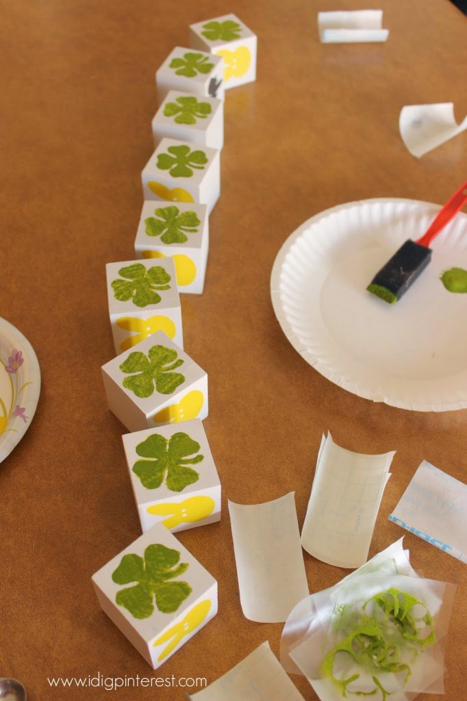 Paint your symbols through the stencils. If using vinyl, simply remove the inside, or the part you want to eventually show up on your block, rub onto the block really well (I actually vigorously scratched around the edges of the design to seal it to the block) and then paint. Do this really well so your paint won’t bleed around the edges. If it still does a little, you can touch it up later with some white paint and a fine-tipped brush.