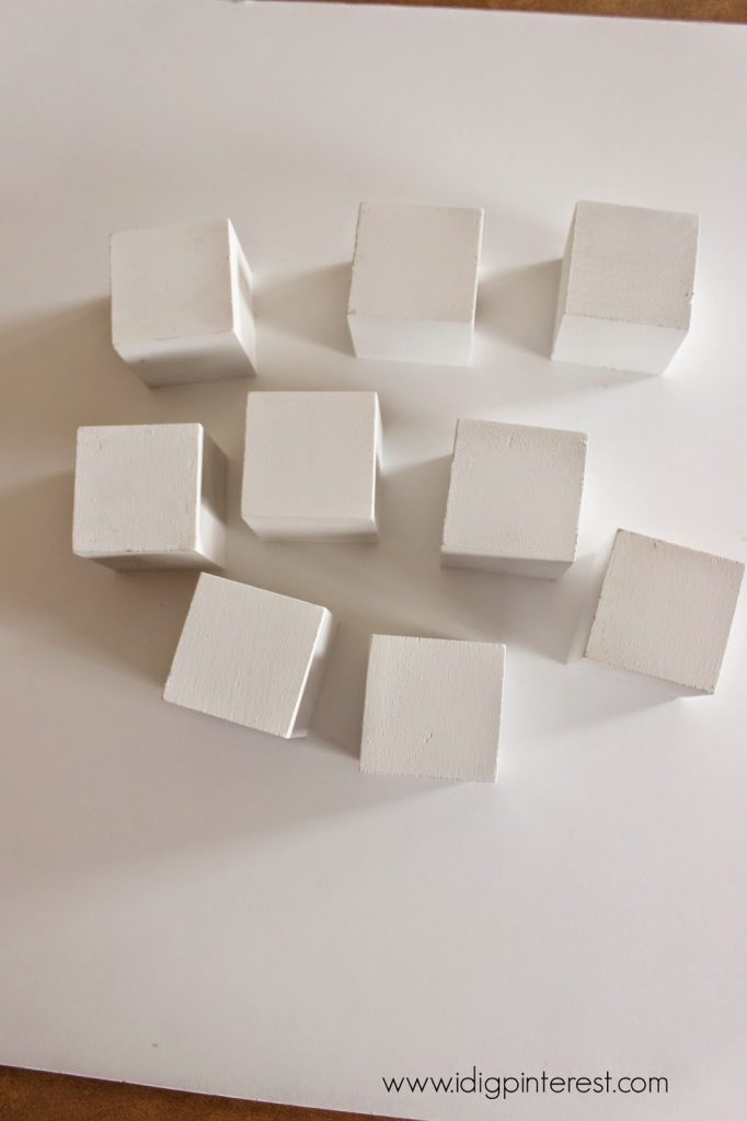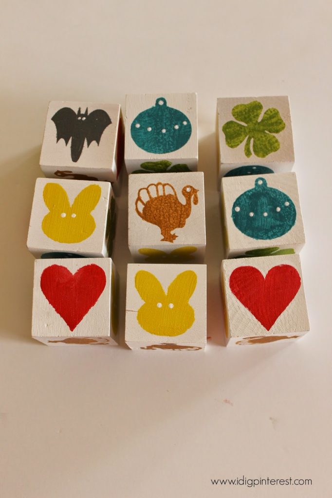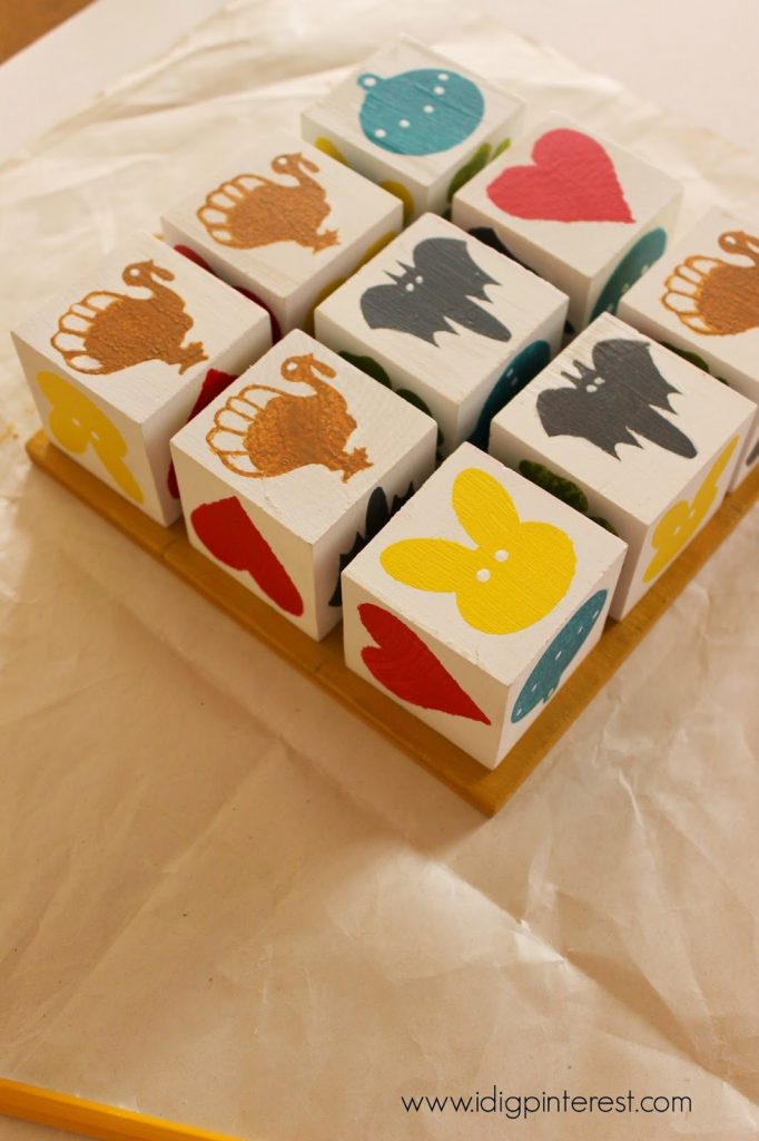 I used my Silhouette machine to cut the designs, then transferred them to the blocks and painted as if they were stencils. If you don’t own a Silhouette, regular stencils will do the trick too.