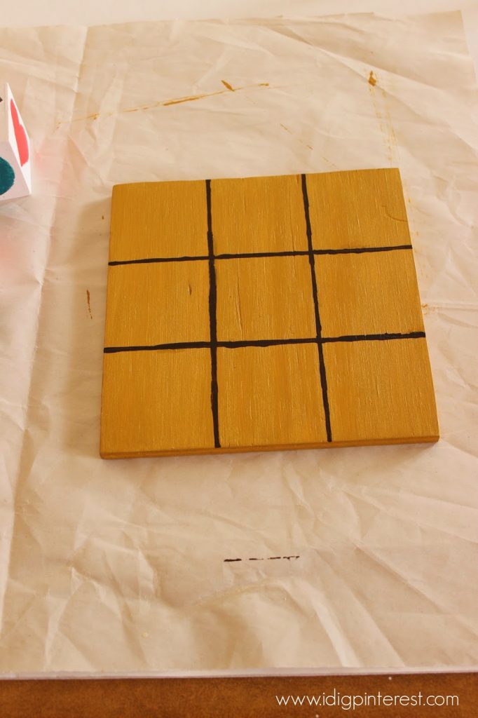 Use a straight edge to paint a line between the markings. You should end up with nine small squares for your tic tac toe blocks to rest. Let dry, then you’re done!