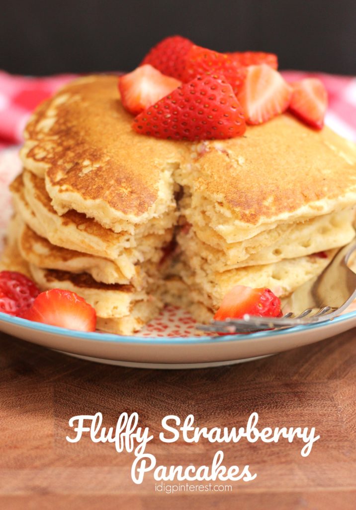 I try my best to maintain a balanced diet (with plenty of fruits and veggies), and that all starts with breakfast! Being the pancake lovers that we are at our house, we have a few go-to versions that we use to switch things up and keep everything interesting. This is one of those stalwart recipes that is in our rotation and always turns out deliciously! The little strawberry treasures nestled inside are enough to make us do jumping jacks! Yes, I’m admitting that it doesn’t take much to make our day amazing! 🙂