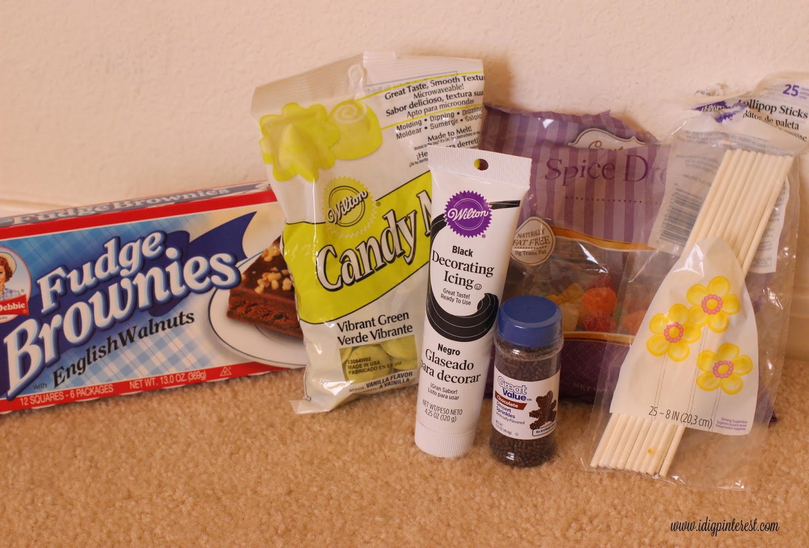Melt candy melts in the microwave in 30 second increments, stirring in between. Coat the fronts of the brownies in candy melts. Immediately add eyes, sprinkles for the hair and gumdrops for bolts. Dip the bottoms of the gumdrops in candy melts to adhere them to the brownie. Set on a plate or cookie sheet. When candy melts are set, pipe on mouth and stitches. Dip ends of sucker sticks in candy melts and insert into brownies. I purchased extra-long sticks so they could go further into the brownies for better support when holding upright. Refrigerate so the brownies will harden and melts will set all the way.