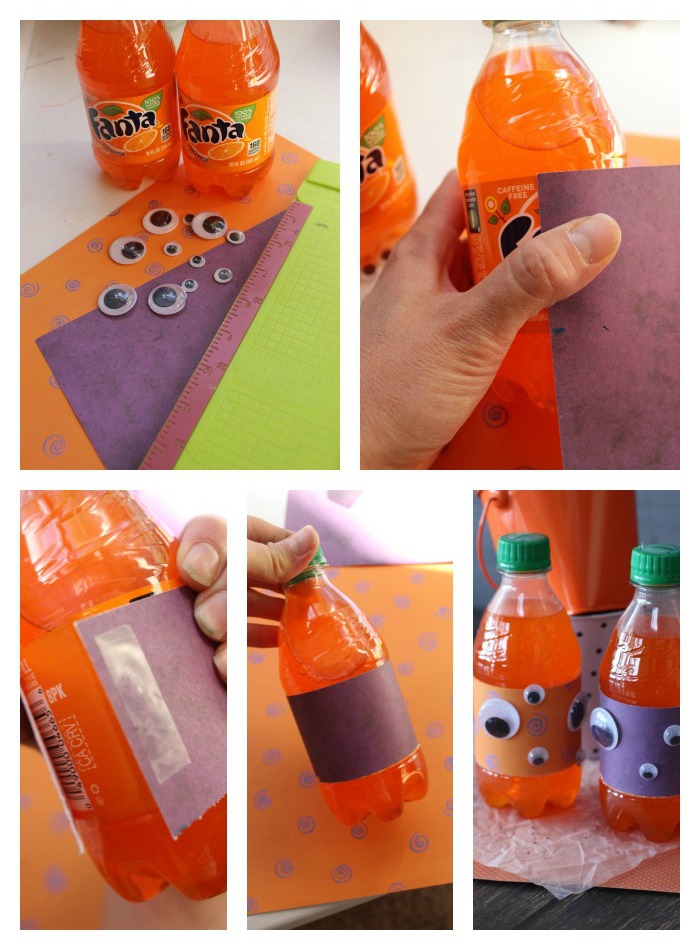 First, measure your paper to be the size of the Fanta label and cut. Adhere it together in the back with a piece of double-sided tape. Lastly, hot glue on various sizes of googly eyes all around the label and that’s it!
