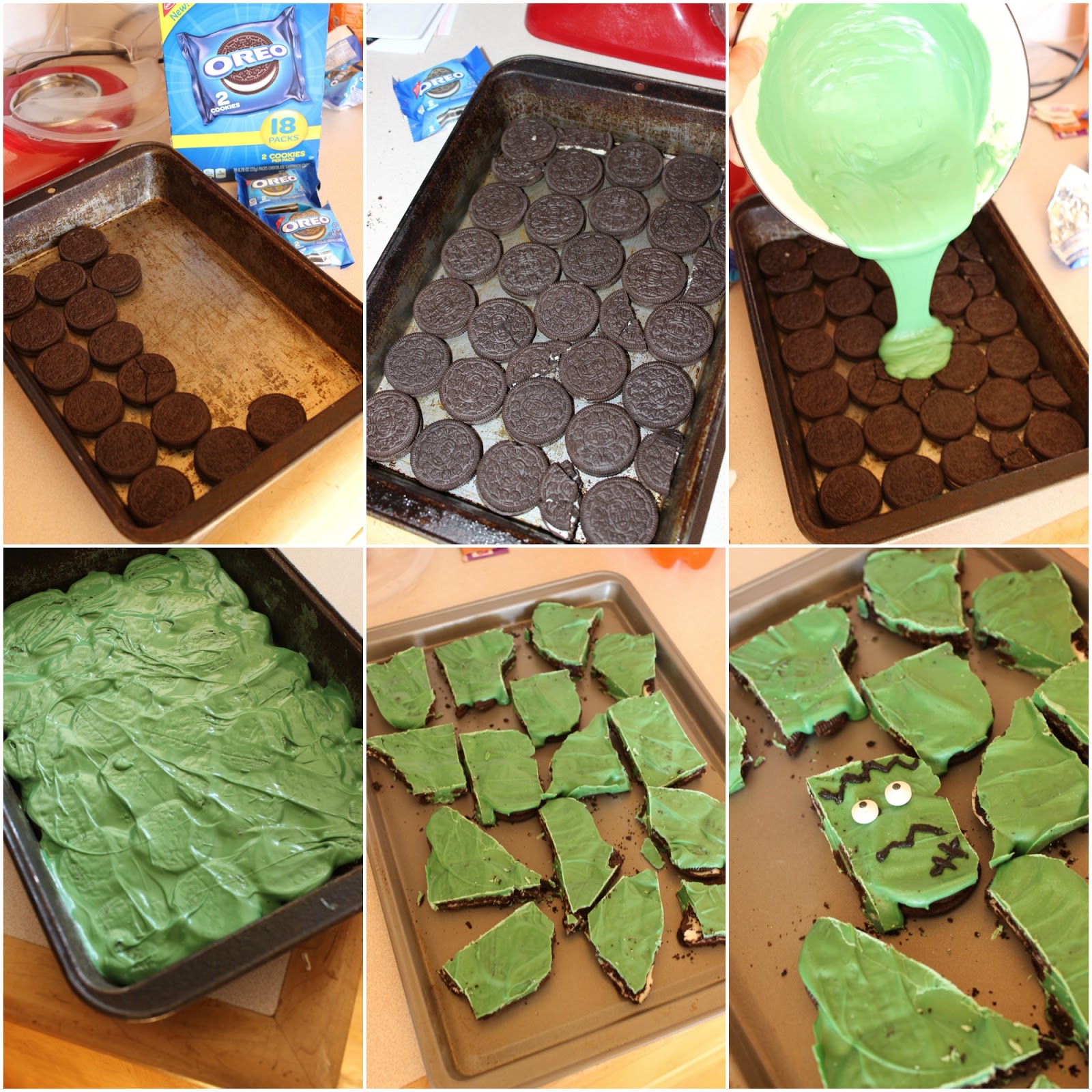So often I’m short on time, but I need to bring a treat to this or that event, so I always jump, no leap, with excitement when I find a simple yet crowd-pleasing recipe. Today’s OREO Cookie Bark is one of the easiest, most adaptable desserts you will ever make. In this case, I poured green candy melts over it and used black decorator icing and edible eyes to turn each jagged piece into a mini Frankenstein head, but the options are pretty much endless.
