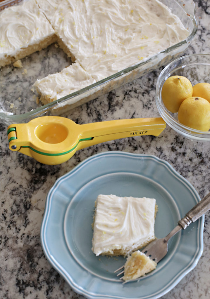 - For the frosting, in the bowl of an electric mixer, cream together softened butter, powdered sugar and fresh lemon juice. Add milk, one tablespoon at a time, as necessary, for thinning, mixing well in between, until desired consistency is reached. It should be nice and creamy. One Tablespoon was all it took for me. Frost, add fresh lemon zest for garnish (optional), slice, and serve.