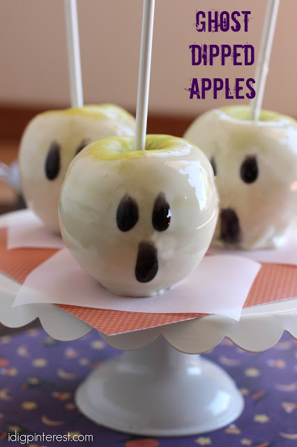 Apples covered in melted marshmallows are made to look like scary ghosts just in time for Halloween! This sticky, gooey, spooky Halloween treat will get rave reviews from all who are privileged to enjoy!