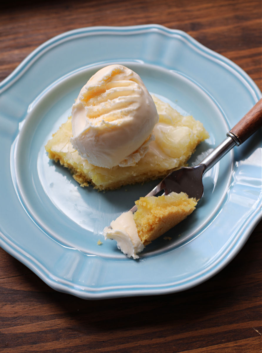 The bottom layer consists of a yellow cake mix and a few add-ins. Then, you spread a sweetened cream cheese layer over that and bake it just until it’s set. The top will get all flaky and pretty. Promise me you’ll top these with a nice scoop of vanilla ice cream, ok? They’re totally yummy without, but even better with the ice cream. You won’t be sorry!