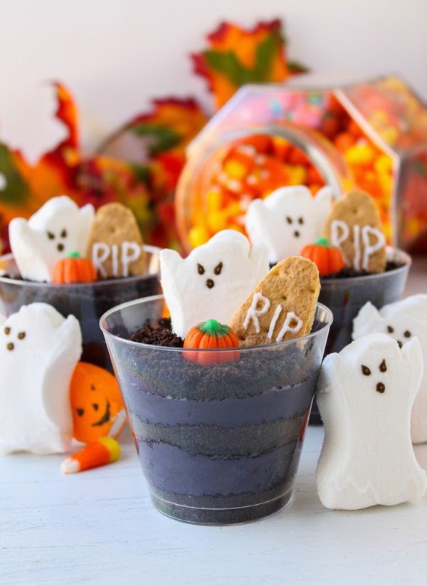 If you are throwing a Halloween party, these Graveyard Cheesecake Parfaits are a great make-ahead treat! They are a spook-ified version of these super easy No Bake Cheesecake Parfaits. You can make them a few hours or even a few days in advance, and they are totally adaptable to whatever candy you have on hand. I found the ghost peeps at Rite Aid, and made some really sophisticated tombstones out of graham crackers and frosting. Happy Halloween everyone!