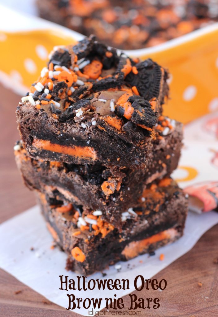 - Make brownie batter by mixing together brownie mix, egg, vegetable oil and milk in an electric mixer. Spread carefully over Oreos. Crush 7 more Oreos in a zip top bag and sprinkle over the top of the batter. Add Halloween sprinkles. Bake for approximately 30-35 minutes. Allow them to cool completely before cutting into bars.