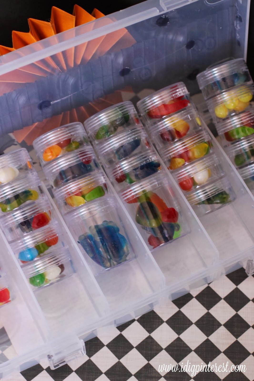 This is a perfectly fun Halloween project to do with kids! Let them fill the mini specimen containers with bugs (gummy candies) and spider eggs (jelly beans)!