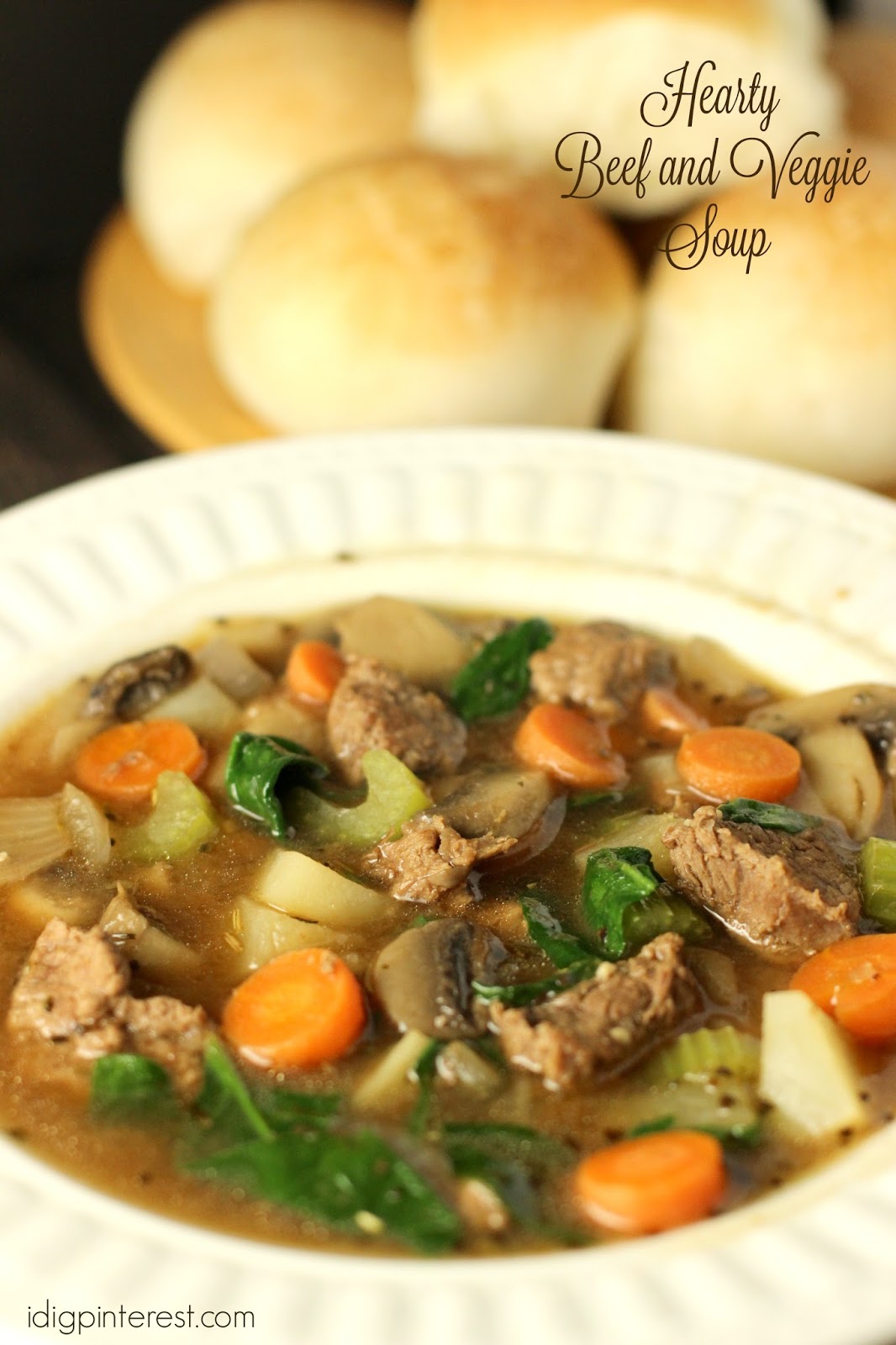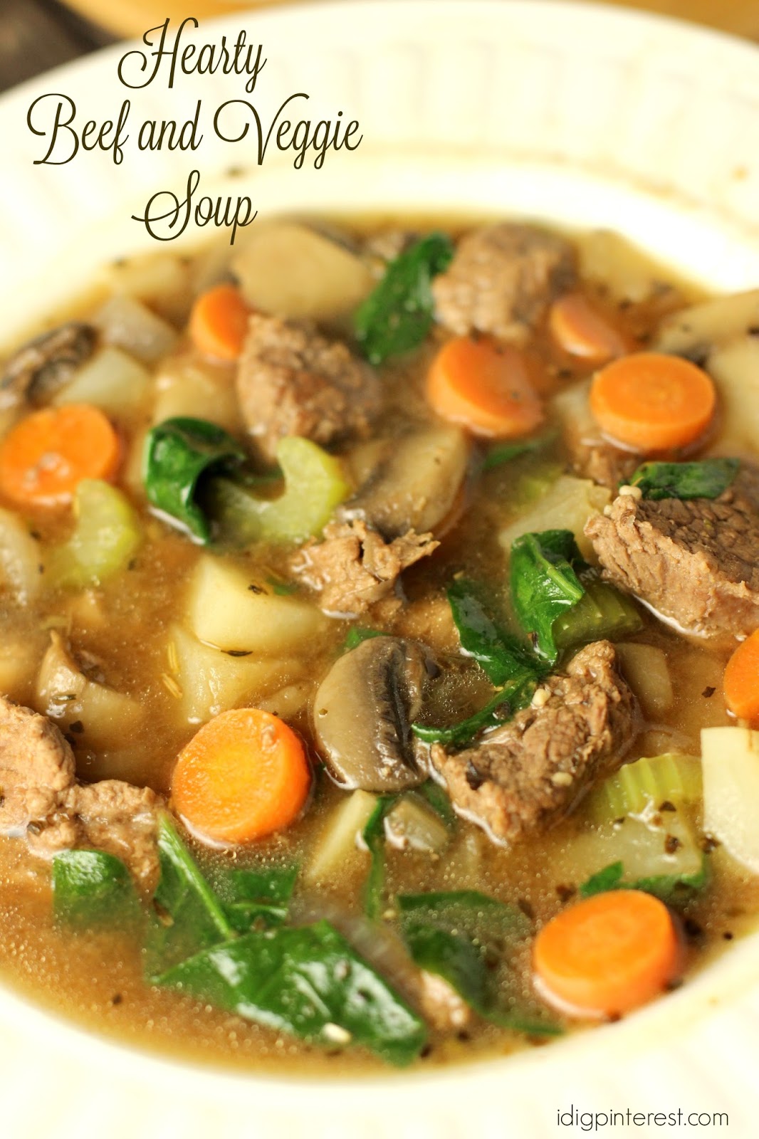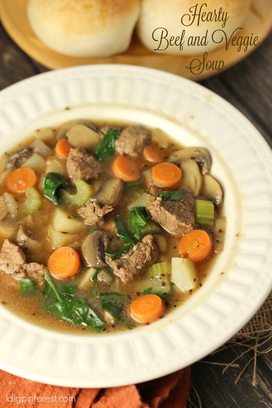 Carrots, mushrooms celery, spinach, potatoes and bite-sized chunks of beef swim in a savory, seasoned-to-perfection beef broth to make this bowl of goodness.