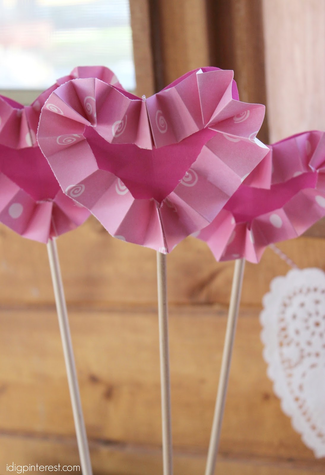 To make these, simply cut out cardstock hearts, fold two patterned paper accordions (the width and length will depend on the size of your heart), attach the pieces together with hot glue and then glue in place to the top center of the heart.  Then pull the accordion pieces around the heart form, hot glue in place, then hot glue the pieces together again at the bottom center of the heart, and finish by gluing that to the cardstock heart form.  So easy and super cute!  I glued mine to some wooden dowels and placed them in a pretty mini bucket filled with glass rocks.