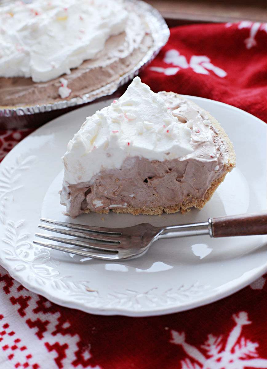 Today’s dessert is a product of another Hallmark Christmas movie. After Halloween passes, I start watching all the Hallmark holiday films. It really brings the Christmas magic into my home. I love it! In one in particular, there was a pie bakeoff and the taste testers were presented with a Hot Chocolate Pie that looked absolutely divine! There was a graham cracker crust, a creamy chocolate filling that was studded with mini white marshmallows, then a marshmallow whipped cream topping and crushed peppermint candies to finish it off.