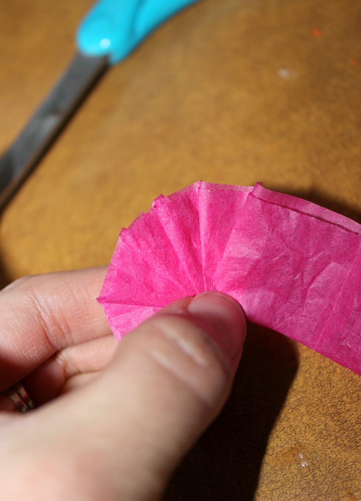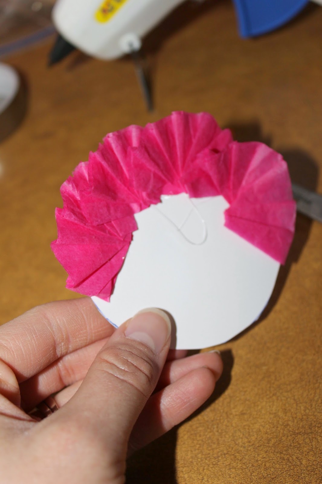 When your folds start to not fan out nicely, cut at a diagonal. Hot glue this piece onto the outer edge of your circle form, ensuring you cannot see the cardstock below. Repeat with the remainder of your folded tissue paper strip, gluing the mini fans in between. Cut another strip of tissue paper exactly the same size if you run out, and repeat the process.