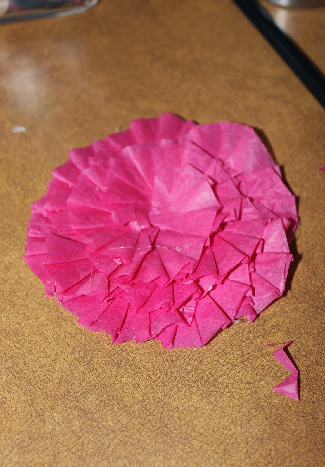 Continue layering and gluing your tissue paper fans side by side, beginning from the outside of the circle and spiraling your way in.