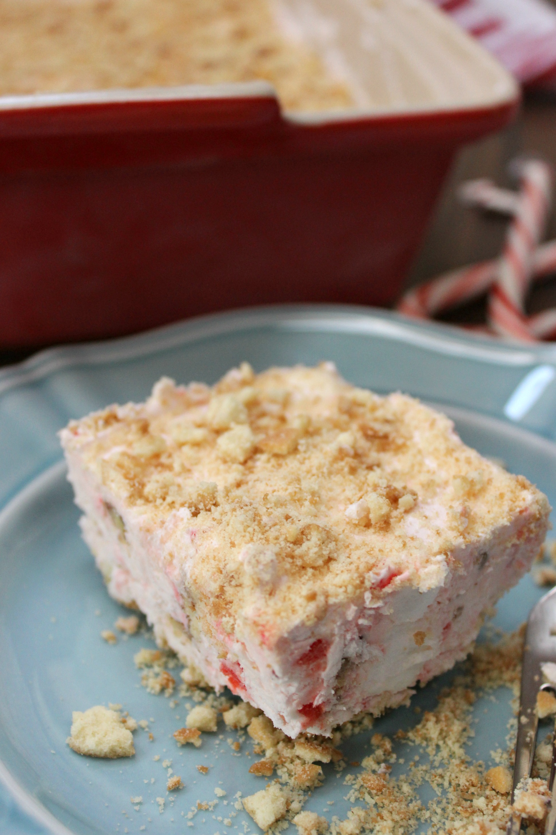 The crust consists of crushed vanilla wafers. You’re going to drool when I tell you about this next part. Pecans, marshmallows, crushed peppermint candy canes, and finely-diced maraschino cherries are folded into fluffy whipped cream. Then, just before serving, you add a bunch more crushed vanilla wafers to top it all off!